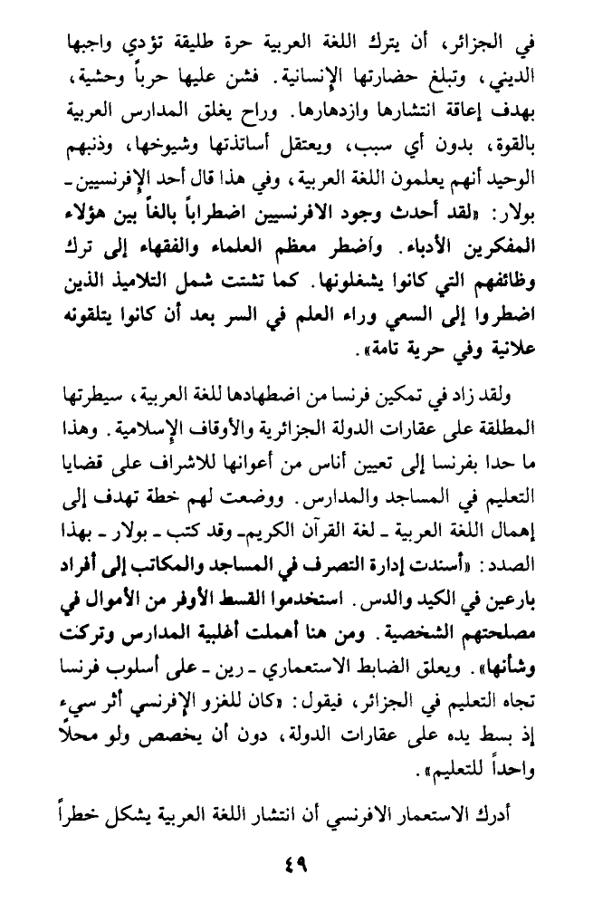 في الجزائر، أن يترك اللغة العربية حرة طليقة تؤدي واجبها الديني، وتبلغ حضارتها الإنسانية. فشن عليها حربا وحشية، بهدف إعاقة انتشارها وازدهارها. وراح يغلق المدارس العربية بالقوة، بدون أي سبب، ويعتقل أساتذتها وشيوخها، وذنبهم الوحيد أنهم يعلمون اللغة العربية، وفي هذا قال أحد الإفرنسيين - بولار: (لقد أحدث وجود الإفرنسيين اضطرابا بالغا يين هؤلاء المفكرين الأدباء. واضطر معظم العلماء والفقهاء إلى ترك وظائفهم التي كانوا يشغلونها. كما تشتت شمل التلاميذ الذين اضطروا إلى السعي وراء العلم في السر بعد أن كانوا يتلقونه علانية وفي حرية تامة).