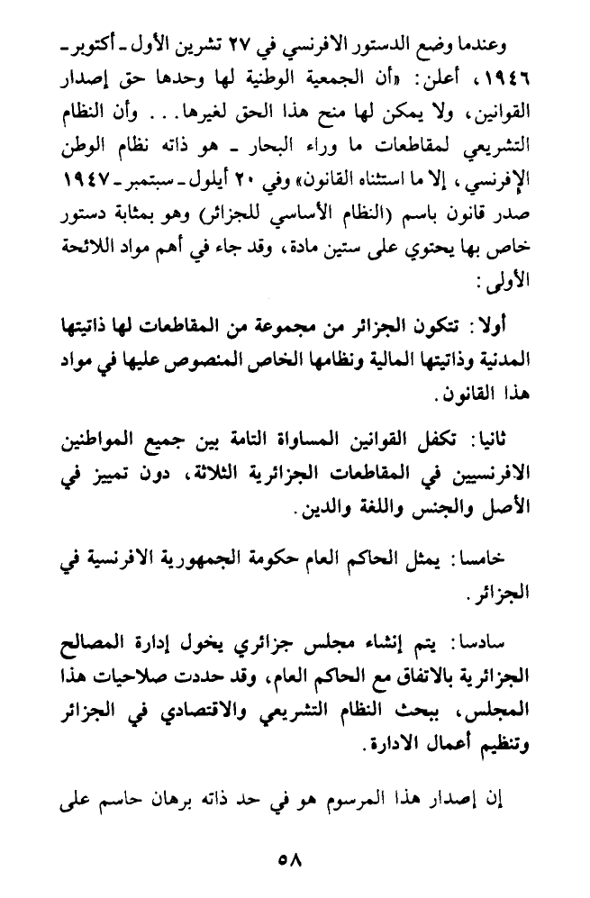 وعندما وضع الدستور الإفرنسي في 27 تشرين الأول - أكتوبر - 1946، أعلن: (أن الجمعية الوطنية لها وحدها حق إصدار القوانين، ولا يمكن لها منح هذا الحق لغيرها ... وأن النظام التشريعي لمقاطعات ما وراء البحار - هو ذاته نظام الوطن الإفرنسي، إلا ما استثناه القانون، وفي 20 أيلول - سبتمبر - 1947 صدر قانون باسم (النظام الأساسي للجزائر) وهو بمثابة دستور خاص بها يحتوي على ستين مادة، وقد جاء في أهم مواد اللائحة الأولى: