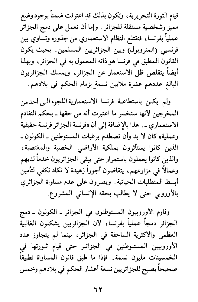قيام الثورة التحريرية، وتكون بذلك قد اعترفت ضمنا بوجود وضع مميز وشخصية مستقلة للجزائر. وإما أن تعمل على دمج الجزائر عمليا بفرنسا، فتقتلع النظام الاستعماري من جذوره وتساوي بين فرنسيي (المتروبرل) وبين الجزائريين المسلمين. بحيث يكون القانون المطبق في فرنسا هو ذاته المعمول به في الجزائر، وبهذا أيضا يتقلص ظل الاستعمار عن الجزائر، ويمسك الجزائريون البالغ عددهم عشرة ملايين نسمة بزمام الحكم في بلادهم.