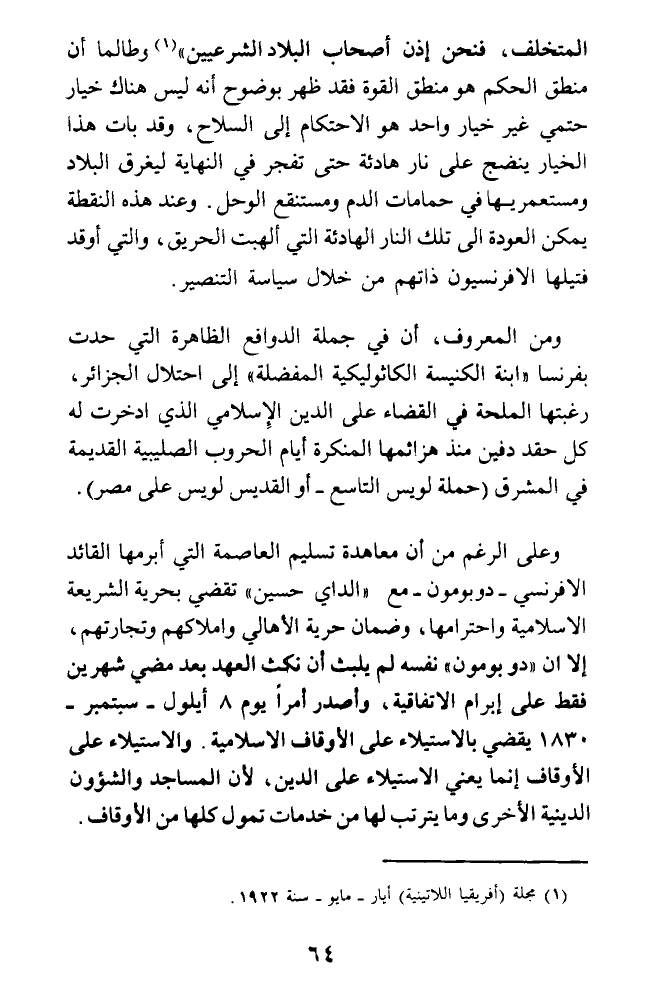 وعلى الرغم من أن معاهدة تسليم العاصمة التي أبرمها القائد الإفرنسي - دوبومون - مع (الداي حسين) تقضي بحرية الشريعة الإسلامية واحترامها، وضمان حرية الأهالي وأملاكهم وتجارتهم، إلا أن (دوبومون) نفسه لم يلبث أن نكث العهد بعد مضي شهرين فقط على إبرام الاتفاقية، وإصدر أمرا يوم 8 أيلول - سبتمبر - 1830 يقضي بالاستيلاء على الأوقاف الإسلامية. والاستيلاء على الأوقاف إنما يعني الاستيلاء على الدين، لأن المساجد والشؤون الديية الأخرى وما يترتب لها من خدمات تمول كلها من الأوقاف.