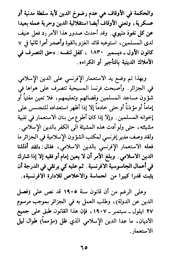 وعلى الرغم من أن قانون سنة 1905 قد نص على (فصل الدين عن الدولة)، وطلب العمل به في الجزائر بموجب مرسوم 27 أيلول - سبتمر - 1907، فإن هذا القانون طبق على جميع الأديان، ما عدا الدين الإسلامي الذي ظل (مؤمما) طوال ليل الاستعمار.