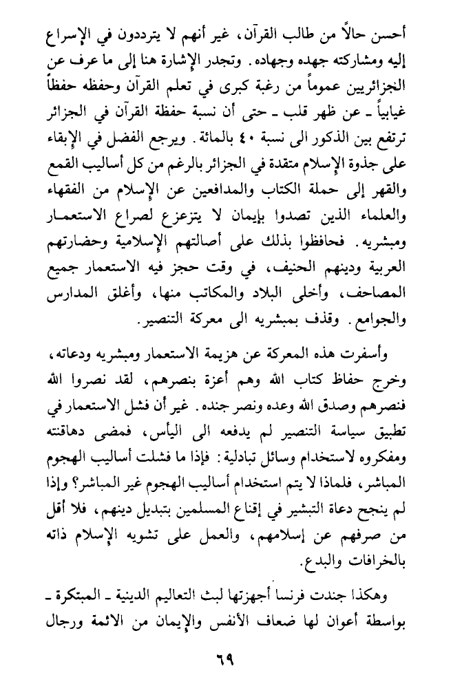 أحسن حالا من طالب القرآن، غير أنهم لا يترددون في الإسراع إليه ومشاركته جهده وجهاده. وتجدر الإشارة هنا إلى ما عرف عن الجزائريين عموما من رغبة كبرى في تعلم القرآن وحفظه حفظا غيابيا - عن ظهر قلب - حتى أن نسبة حفظة القرآن في الجزائر ترتفع بين الذكور إلى نسبة 40 بالمائة. ويرجع الفضل في الإبقاء على جذوة الإسلام متقدة في الجزائر بالرغم من كل أساليب القمع والقهر إلى حملة الكتاب والمدافعين عن الإسلام من الفقهاء والعلماء الذين تصدوا بإيمان لا يتزعزع لصراع الاستعمار ومبشريه. فحافظوا بذلك على أصالتهم الإسلامية وحضارتهم العربية ودينهم الحنيف، في وقت حجز فيه الاستعمار جميع المصاحف، وأخلى البلاد والمكاتب منها، وأغلق المدارس والجوامع. وقذف بمبشريه إلى معركة التنصير.