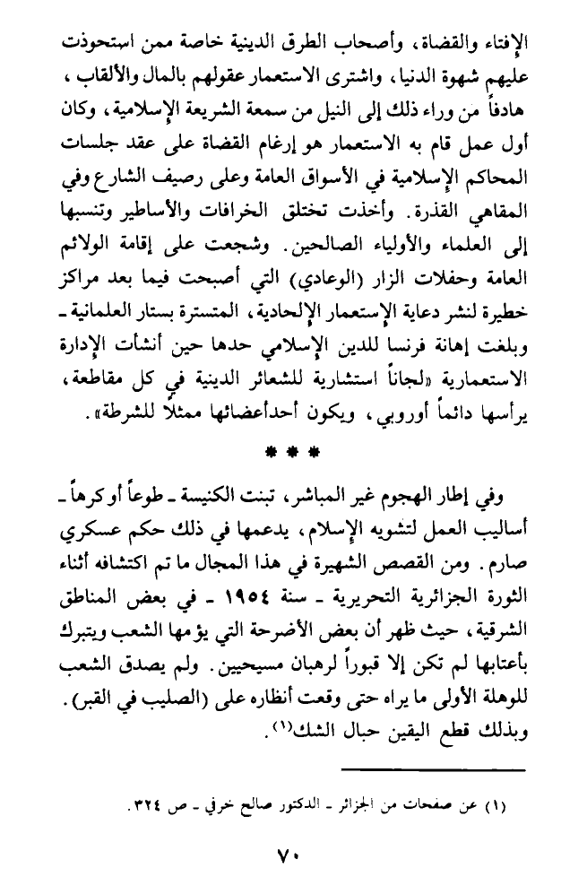 وفي إطار الهجوم غير المباثر، تبنت الكنيسة - طوعا أو كرها - أساليب العمل لتشويه الإسلام، يدعمها في ذلك حكم عسكري صارم. ومن القصص الشهيرة في هذا المجال ما تم اكتشافه أثناء الثورة الجزائرية التحريرية - سنة 1954 - في بعض المناطق الشرقية، حيث ظهر أن بعض الأضرحة التي يؤمها الشعب ويتبرك بأعتابها لم تكن إلا قبورا لرهبان مسيحيين. ولم يصدق الشعب للوهلة الأولى ما يراه حتى وقت أنظاره على (الصليب في القبر). وبذلك قطع اليقين حبال الشثك (¬1).