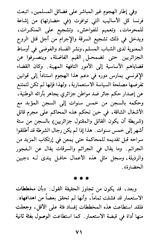وفي إطار الهجوم غير المباشر على فضائل المسلمين، اتبعت فرنسا كل الأساليب التي توافرت (في حضارتها) من إشاعة للمحرمات، وتعميم للفواحش، وتشجيع على المنكرات، ويدخل في ذلك تشجيع السرقة والإجرام من أجل قتل الروح المعنوية لدى الشباب المسلم، ونشر الفساد والفوضى في أوساط الجزائريين حتى تضمحل القيم الفاضلة، وينصرفوا عن قضاياهم الأساسية إلى الأمور التافهة المهينة. وكان القضاء الإفرنسي يمارس دوره في دعم هذا الهجوم استنادا إلى قوانين تفرضها مصلحة السياسة الاستعمارية، ولهذا فإنها لم تكن لتمتنع عن إصدار حكم جائر ضد مواطن جزائري يجاهر بأرائه الوطنية، وحكمه بالسجن من خمس سنوات إلى السجن المؤبد مع الأشغال الشاقة، في حين تحكم هذه المحاكم على مجرم قاتل (شريطة أن يكون القاتل والمقتول جزائريين) بالسجن من ستة أشهر إلى خمس سنوات. هذا إذا لم يكن رجال الشرطة قد أطلقوا سراحه قبل تقديمه للمحاكمة حتى يمعن في إرتكاب المزيد من الجرائم. وما يقال في الجرائم والسرقات يقال عن الفجور والرذيلة، وسجل مثل هذه الأعمال حافل يندى له (جبين الحضارة).