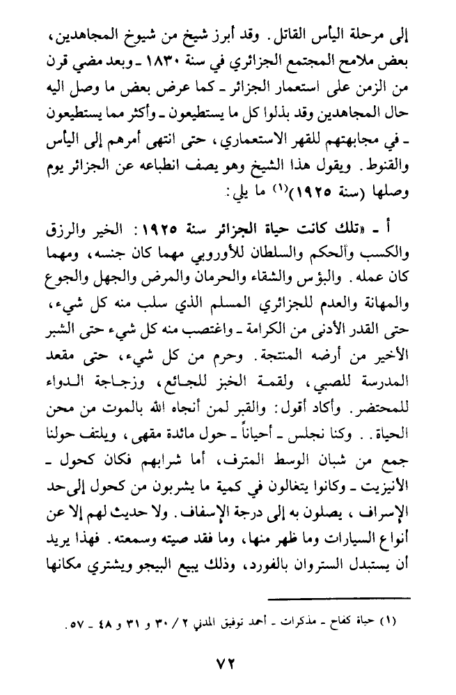 أ - (تلك كانت حياة الجزائر سنة 1925: الخير والرزق والكسب والحكم والسلطان للأوروبي مهما كان جنسه، ومهما كان عمله. والبؤس والشقاء والحرمان والمرض والجهل والجوع والمهانة والعدم للجزائري المسلم الذي سلب منه كل شيء، حتى القدر الأدنى من الكرامة - واغتصب منه كل شيء حتى الشبر الأخير من أرضه المنتجة. وحرم من كل شيء، حتى مقعد المدرسة للصبي، ولقمة الخبز للجائع، وزجاجة الدواء للمحتضر. وأكاد أقول: والقبر لمن أنجاه الله بالموت من محن الحياة .. وكنا نجلس - أحيانا - حول مائدة مقهى، ويلتف حولنا جمع من شبان الوسط المترف، أما شرابهم فكان كحول - الأنيزيت - وكانوا يتغالون في كمية ما يشربون من كحول إلى حد الإسراف، يصلون به إلى درجة الإسعاف. ولا حديث لهم إلا عن أنواع السيارات وما ظهر منها، وما فقد صيته وسمعته. فهذا يريد أن يستبدل الستروان بالفورد، وذلك يبيع البيجو ويشتري مكانها