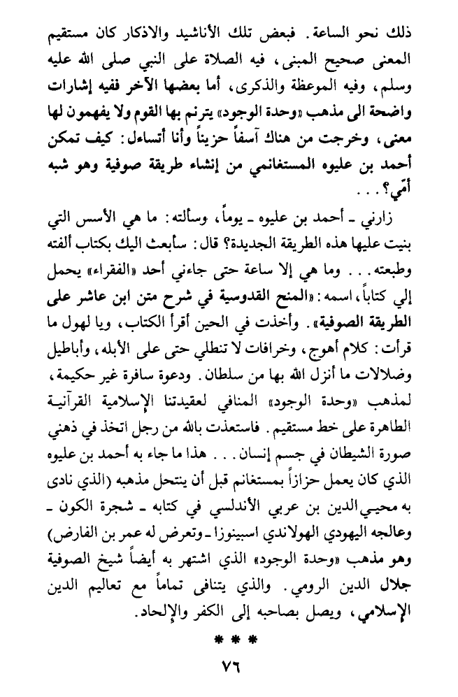 زارني - أحمد بن عليوة - يوما، - وسألته: ما هي الأسس التي بنيت عليها هذه الطريقة الجديدة؟ قال: سأبعث إليك بكتاب ألفته وطبعته ... وما هي إلا ساعة حتى جاءني أحد (الفقراء) يحمل إلي كتابا، اسمه: (المنح القدوسية في شرح متن ابن عاشر على الطريقة الصوفية). وأخذت في الحين أقرأ الكتاب، ويا لهول ما قرأت: كلام أهوج، وخرافات لا تنطلي حتى على الأبله، وأباطيل وضلالات ما أنزل الله بها من سلطان. ودعوة سافرة غير حكيمة، لمذهب (وحدة الوجود) المنافي لعقيدتنا الإسلامية القرآنية الطاهرة على خط مستقيم. فاستعذت بالله من رجل اتخذ في ذهني صورة الشيطان في جسم إنسان ... هذا ما جاء به أحمد بن عليوه الذي كان يعمل حزازا بمستغانم قبل أن ينتحل مذهبه (الذي نادى به محيي الدين بن عربي الأندلسي في كتابه - شجرة الكون - وعالجه اليهودي الهولاندي اسبينوزا - وتعرض له عمر بن الفارض) وهو مذهب (وحدة الوجود) الذي اشتهر به أيضا شيخ الصوفية جلال الدين الرومي. والذي يتنافى تماما مع تعاليم الدين الإسلامي، ويصل بصاحبه إلى الكفر والإلحاد.