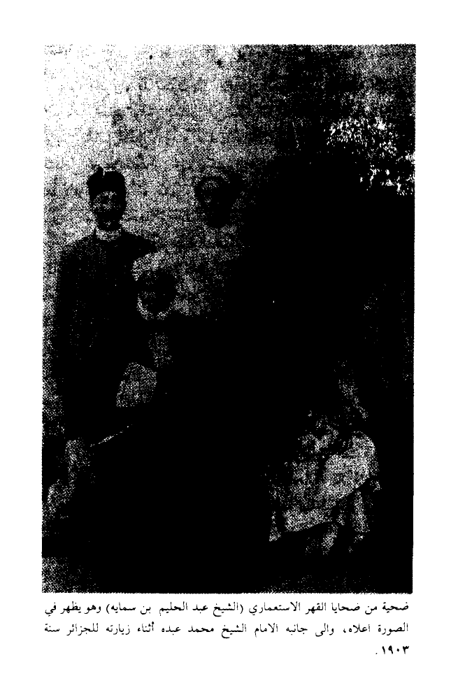 ضحية من ضحايا القهر الاستعماري (الشيخ عبد الحليم بن سماية) وهو يظهر في الصورة أعلاه، وإلى جانبه الإمام الشيخ محمد عبده أثناء زيارته للجزائر سنة 1903.