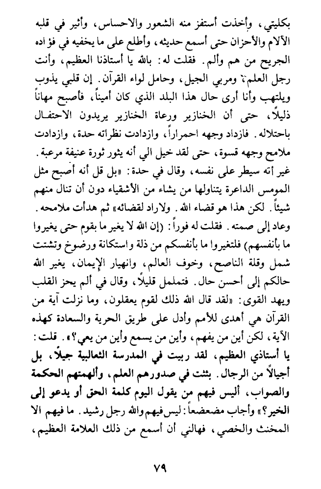بكليتي، وأخذت أستفز منه الشعور والإحساس، وأثير في قلبه الآلام والأحزان حتى أسمع حديثه، وأطلع على ما يخفيه في فؤاده الجريح من هم وألم. فقلت له: بالله يا أستاذنا العظيم، وأنت رجل العلم ومربي الجيل، وحامل لواء القرآن. إن قلبي يذوب ويلتهب وأنا أرى حال هذا البلد الذي كان أمينا، فأصبح مهانا ذليلا، حتى أن الخنازير ورعاة الخنازير يريدون الاحتفال باحتلاله. فازداد وجهه احمرارا، وازدادت نظراته حدة، وازدادت ملامح وجهه قسوة، حتى لقد خيل إلي أنه يثور ثورة عنيفة مرعبة. غير أنه سيطر على نفسه، وقال في حدة: (بل قل أنه أصبح مثل المومس الداعرة يتناولها من يشاء من الأشقياء دون أن تنال منهم شيئا. لكن هذا هو قضاء الله. ولا راد لقضائه) ثم هدأت ملامحه. وعاد إلى صمته. فقلت له فورا: (إن الله لا يغير ما بقوم حتى يغيروا ما بأنفسهم) فلتغيروا ما بأنفسكم من ذلة واستكانة ورضوخ وتشتت شمل وقلة الناصح، وخوف العالم، وانهيار الإيمان، يغير الله حالكم إلى أحسن حال. فتململ قليلا، وقال في ألم يحز القلب ويهد القوى: (لقد قال الله ذلك لقوم يعقلون، وما نزلت آية من القرآن هي أهدى للأمم وأدل على طريق الحرية والسعادة كهذه الآية، لكن أين من يفهم، وأين من يسمع وأين من يعي؟) قلت: (يا أستاذي العظيم، لقد ربيت في المدرسة الثعالبية جيلا، بل أجيالا من الرجال. بثثت في صدورهم العلم، وألهمتهم الحكمة والصواب، أليس فيهم من يقول اليوم كلمة الحق أو يدعو إلى الخير؟) وأجاب مضعضعا: ليس فيهم…والله رجل رشيد. ما فيهم إلا المخنث والخصي، فهالني أن أسمع من ذلك العلامة العظيم،