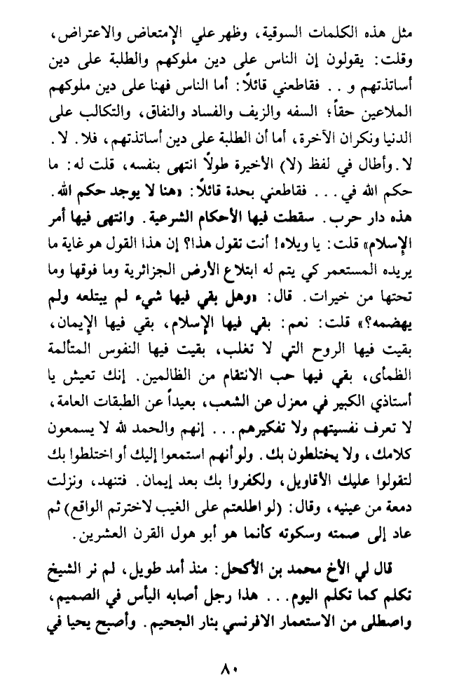 مثل هذه الكلمات السوقية، وظهر علي الإمتعاض والاعتراض، وقلت: يقولون إن الناس على دين ملوكهم والطلبة على دين أساتذتهم و .. فقاطعني قائلا: أما الناس فهنا على دين ملوكهم الملاعين حقا؛ السفه والزيف والفساد والنفاق، والتكالب على الدنيا ونكران الآخرة، أما أن الطلبة على دين أساتذتهم، فلا. لا. لا. وأطال في لفظ (لا) الأخيرة طولا انتهى بنفسه، قلت له: ما حكم الله في ... فقاطعني بحدة قائلا: (هنا لا يوجد حكم الله. هذه دار حرب. سقطت فيها الأحكام الشرعية. وانتهى فيها أمر الإسلام) قلت: يا ويلاه! أنت تقول هذا؟ إن هذا القول هو غاية ما يريده المستعمر كي يتم له ابتلاع الأرض الجزائرية وما فوقها وما تحتها من خيرات. قال: (وهل بقي فيها شيء لم يبتلعه ولم يهضمه؟) قلت: نعم: بقي فيها الإسلام، بقي فيها الإيمان، بقيت فيها الروح التي لا تغلب، بقيت فيها النفوس المتألمة الظمأى، بقي فيها حب الانتقام من الظالمين. إنك تعيش يا استاذي الكبير في معزل عن الشعب، بعيدا عن الطبقات العامة، لا تعرف نفسيتهم ولا تفكيرهم ... إنهم والحمد لله لا يسمعون كلامك، ولا يختلطون بك. ولو أنهم استمعوا إليك أو اختلطوا بك لتقولوا عليك الأقاويل، ولكفروا بك بعد إيمان. فتنهد، ونزلت دمعة من عينيه، وقال: (لو اطلعتم على الغيب لاخترتم الواقع) ثم عاد إلى صمته وسكوته كأنما هو أبو هول القرن العشرين.