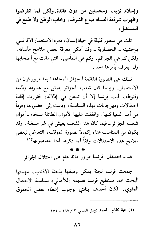 تلك هي سطور قليلة في حياة إنسان، دمره الاستعمار الإفرنسي بوحشيته - الحضارية - وقد أمكن معرفة بعض ملامح مأساته. ولكن كم هي الجرائم، وكم هي المآسي، التي ماتت مع أصحابها ولم يعرف بأمرها أحد.