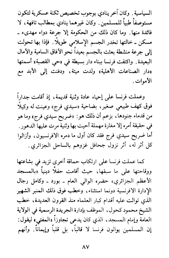السياسة. وكان آخر ينادي بوجوب تخصيص ثكنة عسكرية لتكون مستوصفا طبيا للمسلمين. وكان غيرهما ينادي بمطالب تافهة، لا فائدة منها. وما كان ذلك من الحكومة إلا جرعة دواء مهدىء - مسكن - خالتها تخدر الجسم الإسلامي طويلا. فإذا بها تحولت إلى جرعة منشطة بعثت بالجسم بعيدا نحو الآفاق السامية والآمال البعيدة. واكتفت فرنسا ببناء دار بسيطة في (حي القصبة) أسمتها (دار الصناعات الأهلية) ولدت ميتة، ودفنت إلى الأبد مع الأموات.