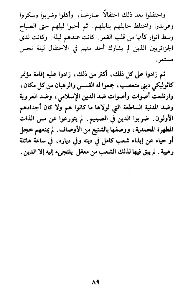 واحتفلوا بعد ذلك احتفالا صارخا، وأكلوا وشربوا وسكروا وعربدوا واختلط حابلهم بنابلهم. ثم أحيوا ليلهم حتى الصباح وسط أنوار كأنها من قلب القمر. كانت عندهم ليلة. وكانت لدى الجزائريين الذين لم يشارك أحد منهم في الاحتفال ليلة نحس مستمر.