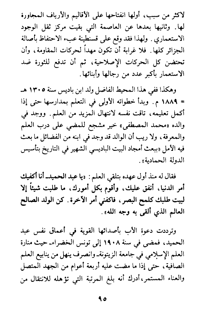 وهكذا ففي هذا المحيط الفاضل ولد ابن باديس سنة 1305 هـ = 1889 م. وبدأ خطواته الأولى في التعلم بمدارسها حتى إذا أكمل تعليمه، تاقت نفسه لانتهال المزيد من العلم. ووجد في والده (محمد المصطفى) خير مشجع للمضي على درب العلم والمعرفة، ولا ريب أن الوالد قد وجد في ابنه من الفضائل ما بعث فيه الأمل (ببعث أمجاد البيت الباديسي الشهير في التاريخ بتأسيس الدولة الحمادية).