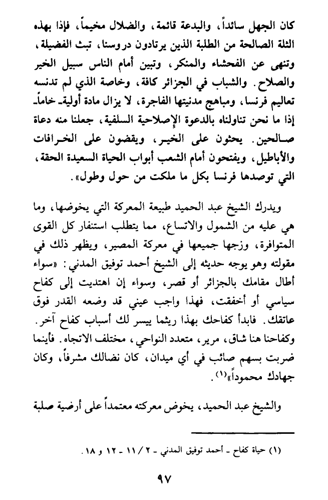 كان الجهل سائدا، والبدعة قائمة، والضلال مخيما، فإذا بهذه الثلة الصالحة من الطلبة الذين يرتادون دروسنا، تبث الفضيلة، وتنهى عن الفحشاء والمنكر، وتبين أمام الناس سبيل الخير والصلاح. والشباب في الجزائر كافة، وخاصة الذي لم تدنسه تعاليم فرنسا، ومباهج مدينتها الفاجرة، لا يزال مادة أولية - خاما - إذا ما نحن تداولناه بالدعوة الإصلاحية السلفية، جعلنا منه دعاة صالحين. يحثون على الخير، ويقضون على الخرافات والأباطيل، ويفتحون أمام الشعب أبواب الحياة السعيدة الحقة، التي توصدها فرنسا بكل ما ملكت من حول وطول).