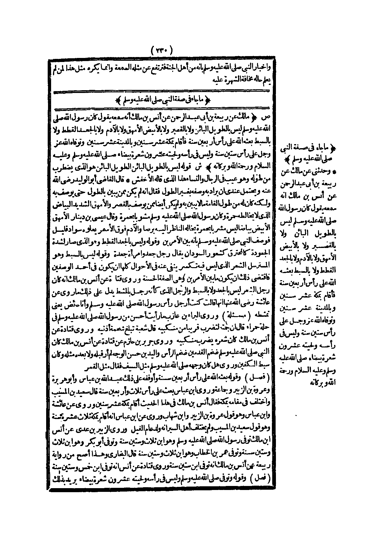 مَا جَاءَ فِي صِفَةِ النَّبِيِّ - صَلَّى اللَّهُ عَلَيْهِ وَسَلَّمَ - (ص) : (مَالِكٌ عَنْ رَبِيعَةَ بْنِ أَبِي عَبْدِ الرَّحْمَنِ عَنْ أَنَسِ بْنِ مَالِكٍ أَنَّهُ سَمِعَهُ يَقُولُ كَانَ رَسُولُ اللَّهِ - صَلَّى اللَّهُ عَلَيْهِ وَسَلَّمَ - لَيْسَ بِالطَّوِيلِ الْبَائِنِ وَلَا بِالْقَصِيرِ وَلَا بِالْأَبْيَضِ الْأَمْهَقِ وَلَا بِالْآدَمِ وَلَا بِالْجَعْدِ الْقَطَطِ وَلَا بِالسَّبْطِ بَعَثَهُ اللَّهُ عَلَى رَأْسِ أَرْبَعِينَ سَنَةً فَأَقَامَ بِمَكَّةَ عَشْرَ سِنِينَ وَبِالْمَدِينَةِ عَشْرَ سِنِينَ وَتَوَفَّاهُ اللَّهُ عَزَّ وَجَلَّ عَلَى رَأْسِ سِتِّينَ سَنَةً وَلَيْسَ فِي رَأْسِهِ وَلِحْيَتِهِ عِشْرُونَ شَعْرَةً بَيْضَاءَ - صَلَّى اللَّهُ عَلَيْهِ وَسَلَّمَ - وَعَلَيْهِ السَّلَامُ وَرَحْمَةُ اللَّهِ وَبَرَكَاتُهُ) .