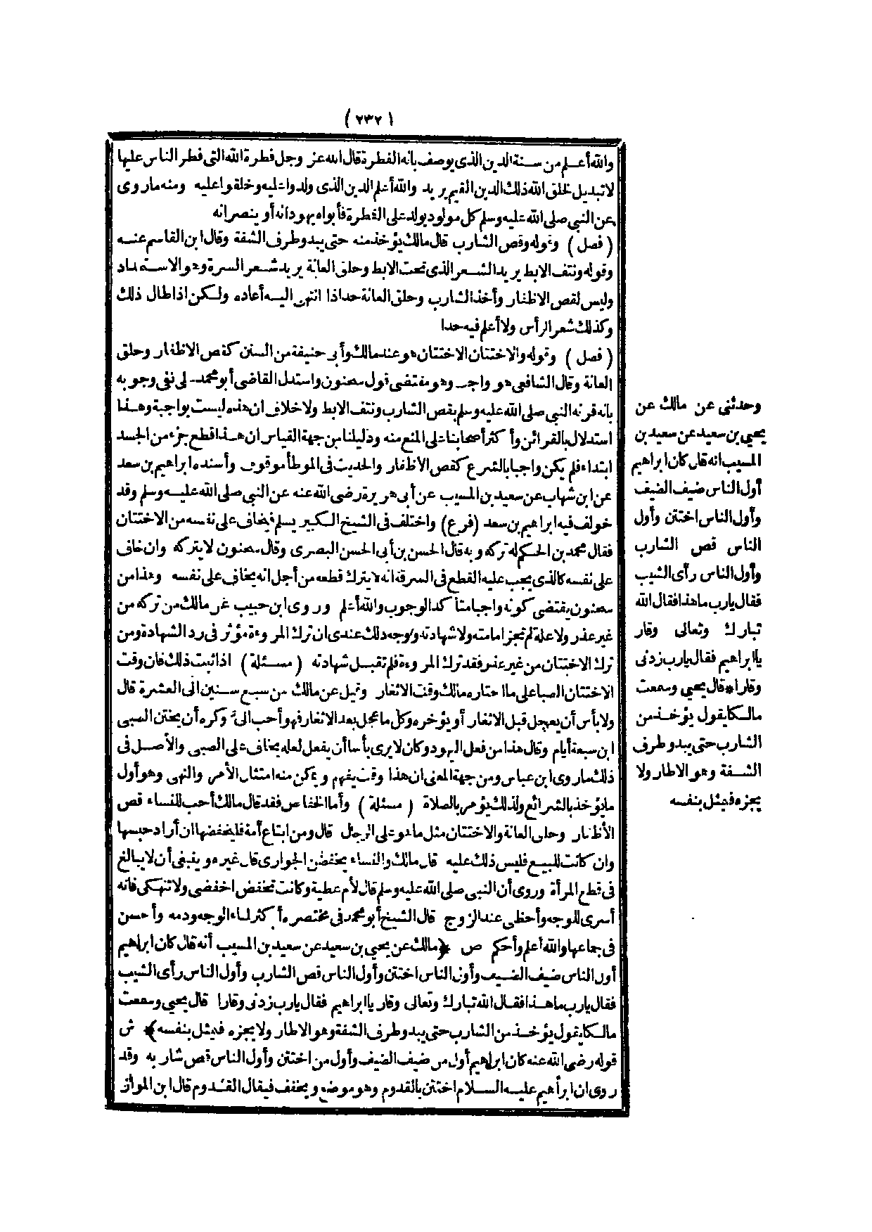 (ص) : (مَالِكٌ عَنْ يَحْيَى بْنِ سَعِيدٍ عَنْ سَعِيدِ بْنِ الْمُسَيِّبِ أَنَّهُ قَالَ: كَانَ إبْرَاهِيمُ أَوَّلَ النَّاسِ ضَيَّفَ الضَّيْفَ وَأَوَّلَ النَّاسِ اخْتَتَنَ وَأَوَّلَ النَّاسِ قَصَّ الشَّارِبَ وَأَوَّلَ النَّاسِ رَأَى الشَّيْبَ فَقَالَ: يَا رَبِّ مَا هَذَا فَقَالَ اللَّهُ - تَبَارَكَ وَتَعَالَى -: وَقَارٌ يَا إبْرَاهِيمُ فَقَالَ: يَا رَبِّ زِدْنِي وَقَارًا قَالَ يَحْيَى وَسَمِعْت مَالِكًا يَقُولُ يُؤْخَذُ مِنْ الشَّارِبِ حَتَّى يَبْدُوَ طَرَفُ الشَّفَةِ وَهُوَ الْإِطَارُ وَلَا يَجُزُّهُ فَيُمَثِّلَ بِنَفْسِهِ) .