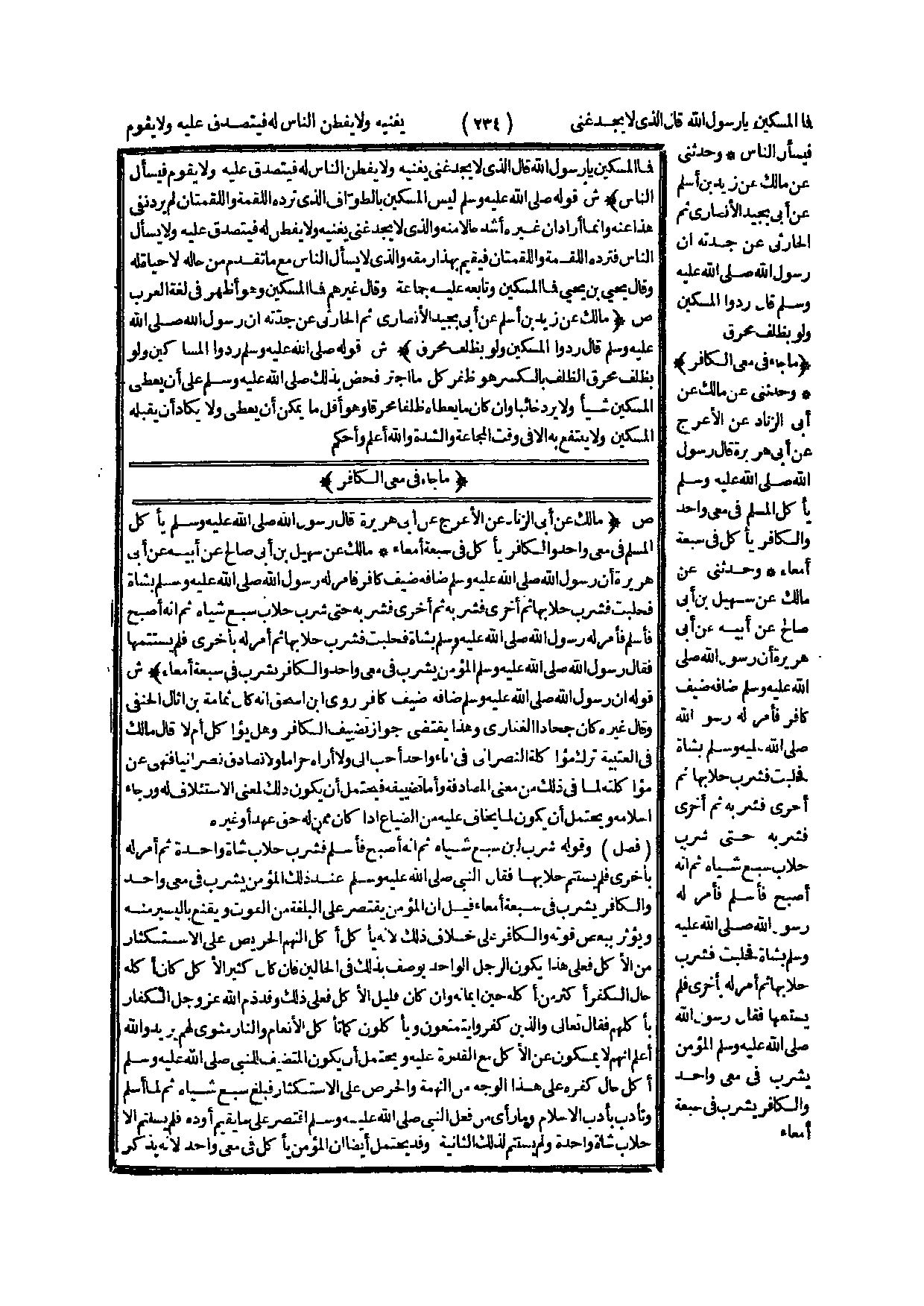 مَا جَاءَ فِي مِعَى الْكَافِرِ (ص) : (مَالِكٌ عَنْ أَبِي الزِّنَادِ عَنْ الْأَعْرَجِ عَنْ أَبِي هُرَيْرَةَ قَالَ رَسُولُ اللَّهِ - صَلَّى اللَّهُ عَلَيْهِ وَسَلَّمَ - «يَأْكُلُ الْمُسْلِمُ فِي مِعًى وَاحِدٍ وَالْكَافِرُ يَأْكُلُ فِي سَبْعَةِ أَمْعَاءٍ» مَالِكٌ عَنْ سُهَيْلِ بْنِ أَبِي صَالِحٍ عَنْ أَبِيهِ عَنْ أَبِي هُرَيْرَةَ «أَنَّ رَسُولَ اللَّهِ - صَلَّى اللَّهُ عَلَيْهِ وَسَلَّمَ - ضَافَهُ ضَيْفٌ كَافِرٌ فَأَمَرَ لَهُ رَسُولُ اللَّهِ - صَلَّى اللَّهُ عَلَيْهِ وَسَلَّمَ - بِشَاةٍ فَحُلِبَتْ فَشَرِبَ حِلَابَهَا، ثُمَّ أُخْرَى فَشَرِبَهُ، ثُمَّ أُخْرَى فَشَرِبَهُ حَتَّى شَرِبَ حِلَابَ سَبْعِ شِيَاهٍ ثُمَّ إنَّهُ أَصْبَحَ فَأَسْلَمَ فَأَمَرَ لَهُ رَسُولُ اللَّهِ - صَلَّى اللَّهُ عَلَيْهِ وَسَلَّمَ - بِشَاةٍ فَحُلِبَتْ فَشَرِبَ حِلَابَهَا، ثُمَّ أَمَرَ لَهُ بِأُخْرَى فَلَمْ يَسْتَتِمَّهَا فَقَالَ رَسُولُ اللَّهِ - صَلَّى اللَّهُ عَلَيْهِ وَسَلَّمَ - الْمُؤْمِنُ يَشْرَبُ فِي مِعًى وَاحِدٍ وَالْكَافِرُ يَشْرَبُ فِي سَبْعَةِ أَمْعَاءٍ» ) .