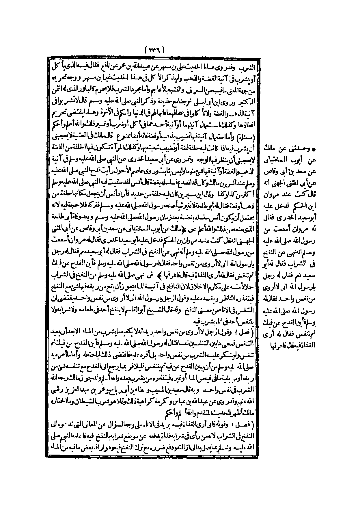 (ص) : (مَالِكٌ عَنْ أَيُّوبَ السِّخْتِيَانِيُّ عَنْ سَعْدِ بْنِ أَبِي وَقَّاصٍ عَنْ أَبِي الْمُثَنَّى الْجُهَنِيِّ أَنَّهُ قَالَ: «كُنْت عِنْدَ مَرْوَانَ بْنِ الْحَكَمِ فَدَخَلَ عَلَيْهِ أَبُو سَعِيدٍ الْخُدْرِيُّ فَقَالَ لَهُ مَرْوَانُ أَسَمِعْتَ مِنْ رَسُولِ اللَّهِ - صَلَّى اللَّهُ عَلَيْهِ وَسَلَّمَ - أَنَّهُ نَهَى عَنْ النَّفْخِ فِي الشَّرَابِ فَقَالَ لَهُ أَبُو سَعِيدٍ نَعَمْ فَقَالَ لَهُ رَجُلٌ: يَا رَسُولَ اللَّهِ إنِّي لَا أُرْوَى مِنْ نَفَسٍ وَاحِدٍ فَقَالَ لَهُ رَسُولُ اللَّهِ - صَلَّى اللَّهُ عَلَيْهِ وَسَلَّمَ - فَأَبِنْ الْقَدَحَ عَنْ فِيكَ، ثُمَّ تَنَفَّسْ فَقَالَ لَهُ أَرَى الْقَذَاةَ فِيهِ قَالَ: فَأَهْرِقْهَا» ) .