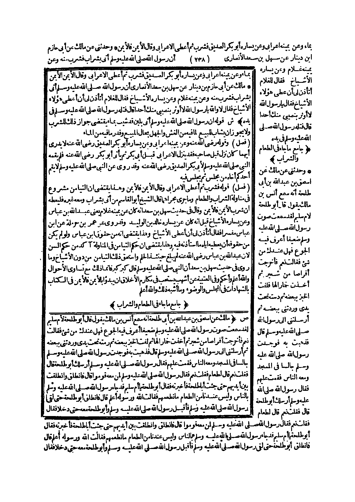 بِمَاءٍ وَعَنْ يَمِينِهِ أَعْرَابِيٌّ وَعَنْ يَسَارِهِ أَبُو بَكْرٍ الصِّدِّيقُ فَشَرِبَ، ثُمَّ أَعْطَى الْأَعْرَابِيَّ وَقَالَ الْأَيْمَنَ الْأَيْمَنَ» مَالِكٌ عَنْ أَبِي حَازِمِ بْنِ دِينَارٍ عَنْ سَهْلِ بْنِ سَعْدٍ الْأَنْصَارِيِّ «أَنَّ رَسُولَ اللَّهِ - صَلَّى اللَّهُ عَلَيْهِ وَسَلَّمَ - أُتِيَ بِشَرَابٍ فَشَرِبَ مِنْهُ وَعَنْ يَمِينِهِ غُلَامٌ وَعَنْ يَسَارِهِ الْأَشْيَاخُ فَقَالَ لِلْغُلَامِ أَتَأْذَنُ لِي أَنْ أُعْطِيَ هَؤُلَاءِ الْأَشْيَاخَ فَقَالَ: لَا وَاَللَّهِ يَا رَسُولَ اللَّهِ لَا أُوثِرُ بِنَصِيبِي مِنْك أَحَدًا قَالَ: فَتَلَّهُ رَسُولُ اللَّهِ - صَلَّى اللَّهُ عَلَيْهِ وَسَلَّمَ - فِي يَدِهِ» ) .