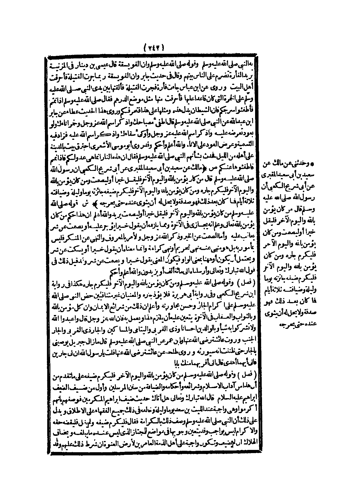 (ص) : (مَالِكٌ عَنْ سَعِيدِ بْنِ أَبِي سَعِيدٍ الْمَقْبُرِيِّ عَنْ أَبِي شُرَيْحٍ الْكَعْبِيِّ أَنَّ رَسُولَ اللَّهِ - صَلَّى اللَّهُ عَلَيْهِ وَسَلَّمَ - قَالَ: «مَنْ كَانَ يُؤْمِنُ بِاَللَّهِ وَالْيَوْمِ الْآخِرِ فَلْيَقُلْ خَيْرًا، أَوْ لِيَصْمُتْ وَمَنْ كَانَ يُؤْمِنُ بِاَللَّهِ وَالْيَوْمِ الْآخِرِ فَلْيُكْرِمْ جَارَهُ وَمَنْ كَانَ يُؤْمِنُ بِاَللَّهِ وَالْيَوْمِ الْآخِرِ فَلْيُكْرِمْ ضَيْفَهُ جَائِزَتُهُ يَوْمٌ وَلَيْلَةٌ وَضِيَافَتُهُ ثَلَاثَةُ أَيَّامٍ فَمَا كَانَ بَعْدَ ذَلِكَ فَهُوَ صَدَقَةٌ وَلَا يَحِلُّ لَهُ أَنْ يَثْوِيَ عِنْده حَتَّى يُحْرِجَهُ» ) .
