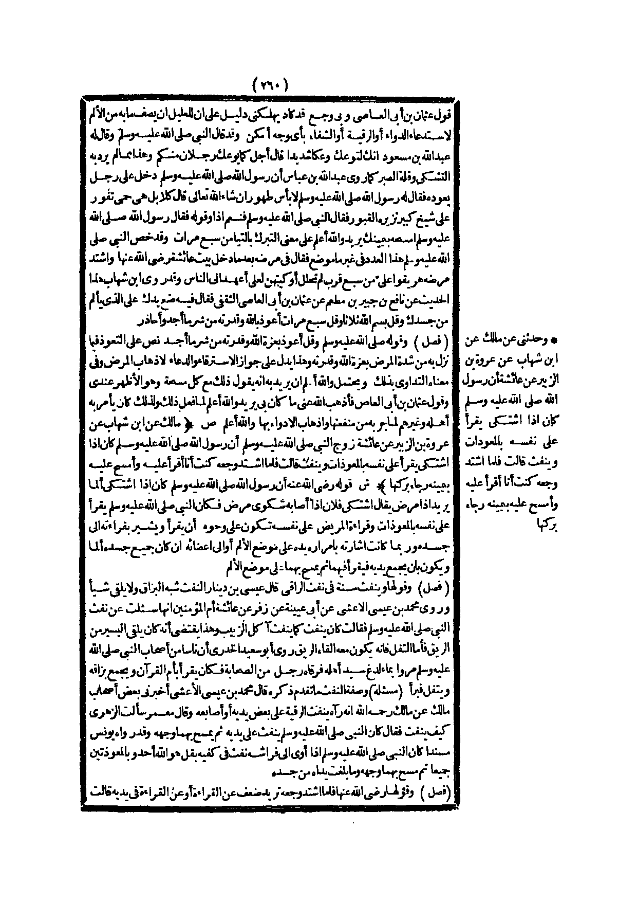 (ص) : (مَالِكٌ عَنْ ابْنِ شِهَابٍ عَنْ عُرْوَةَ بْنِ الزُّبَيْرِ عَنْ عَائِشَةَ زَوْجِ النَّبِيِّ - صَلَّى اللَّهُ عَلَيْهِ وَسَلَّمَ - «أَنَّ رَسُولَ اللَّهِ - صَلَّى اللَّهُ عَلَيْهِ وَسَلَّمَ - كَانَ إذَا اشْتَكَى يَقْرَأُ عَلَى نَفْسِهِ بِالْمُعَوِّذَاتِ وَيَنْفُثُ قَالَتْ فَلَمَّا اشْتَدَّ وَجَعُهُ كُنْتُ أَنَا أَقْرَأُ عَلَيْهِ وَأَمْسَحُ عَلَيْهِ بِيَمِينِهِ رَجَاءَ بَرَكَتِهَا» ) .