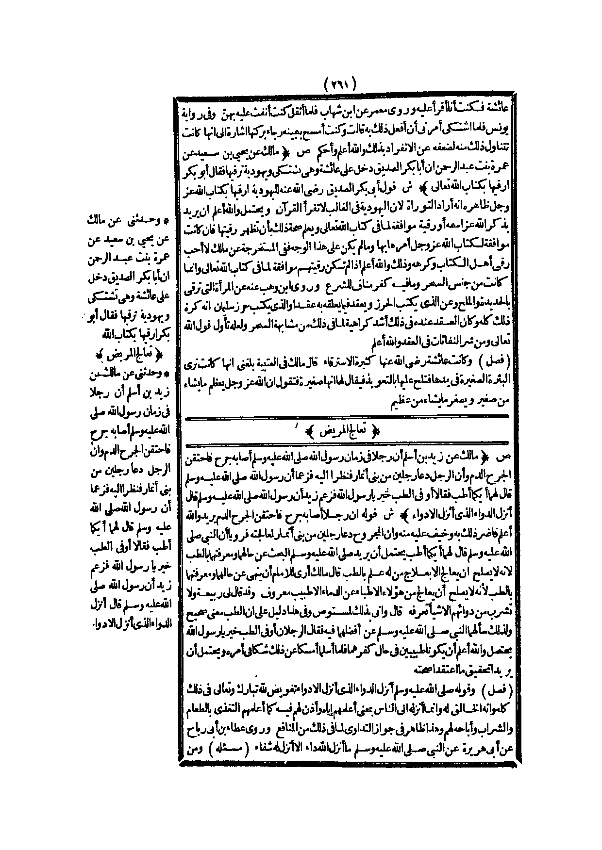 تَعَالُجُ الْمَرِيضِ (ص) : (مَالِكٌ عَنْ زَيْدِ بْنِ أَسْلَمَ «أَنَّ رَجُلًا فِي زَمَانِ رَسُولِ اللَّهِ - صَلَّى اللَّهُ عَلَيْهِ وَسَلَّمَ - أَصَابَهُ جُرْحٌ فَاحْتَقَنَ الْجُرْحُ الدَّمَ وَأَنَّ الرَّجُلَ دَعَا رَجُلَيْنِ مِنْ بَنِي أَنْمَارَ فَنَظَرَا إلَيْهِ فَزَعَمَا أَنَّ رَسُولَ اللَّهِ - صَلَّى اللَّهُ عَلَيْهِ وَسَلَّمَ - قَالَ: لَهُمَا أَيُّكُمَا أَطَبُّ فَقَالَا: أَوَفِي الطِّبِّ خَيْرٌ يَا رَسُولَ اللَّهِ فَزَعَمَ زَيْدٌ أَنَّ رَسُولَ اللَّهِ - صَلَّى اللَّهُ عَلَيْهِ وَسَلَّمَ - قَالَ: أَنْزَلَ الدَّوَاءَ الَّذِي أَنْزَلَ الْأَدْوَاءَ» ) .