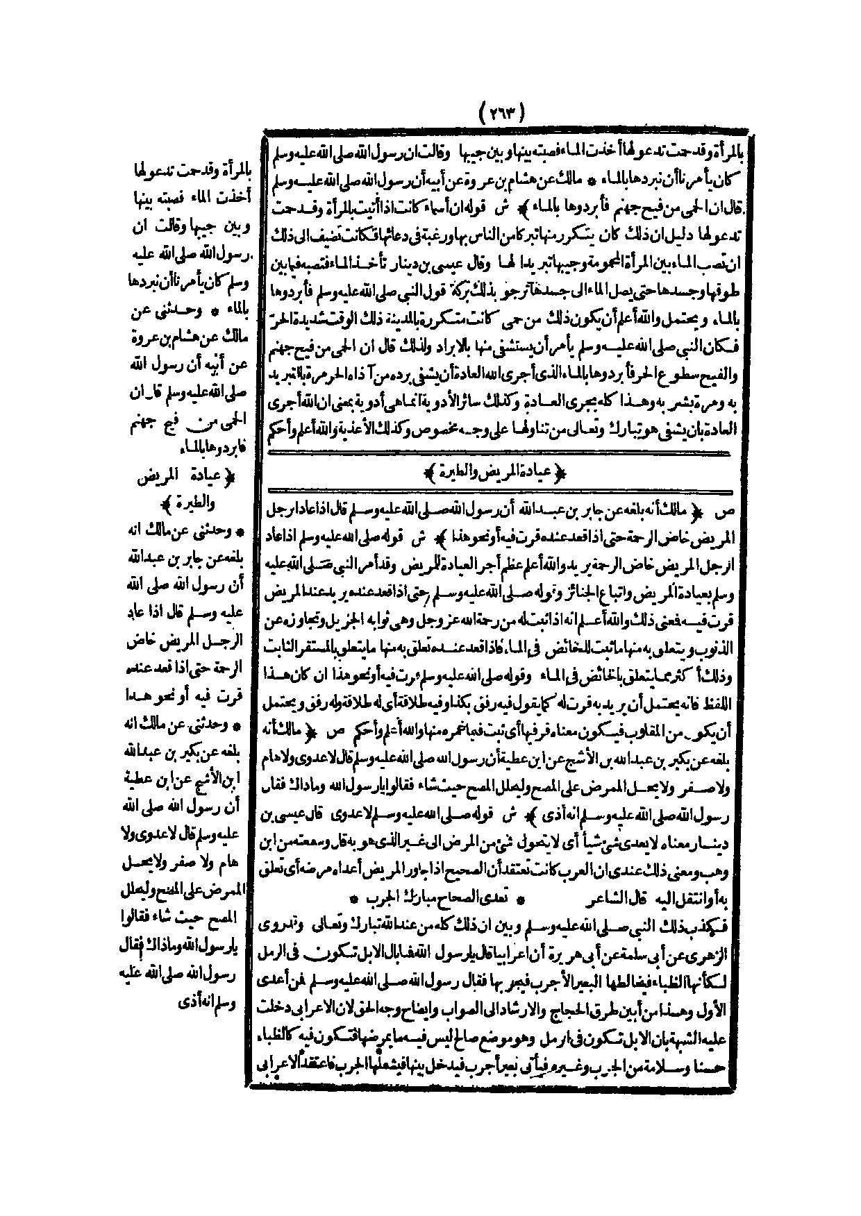 بِالْمَرْأَةِ وَقَدْ حُمَّتْ تَدْعُو لَهَا أَخَذَتْ الْمَاءَ فَصَبَّتْهُ بَيْنَهَا وَبَيْنَ جَيْبِهَا وَقَالَتْ: إنَّ رَسُولَ اللَّهِ - صَلَّى اللَّهُ عَلَيْهِ وَسَلَّمَ - كَانَ يَأْمُرُنَا أَنْ نُبَرِّدَهَا بِالْمَاءِ» مَالِكٌ عَنْ هِشَامِ بْنِ عُرْوَةَ عَنْ أَبِيهِ أَنَّ رَسُولَ اللَّهِ - صَلَّى اللَّهُ عَلَيْهِ وَسَلَّمَ - قَالَ: «إنَّ الْحُمَّى مِنْ فَيْحِ جَهَنَّمَ فَأَبْرِدُوهَا بِالْمَاءِ» ) .