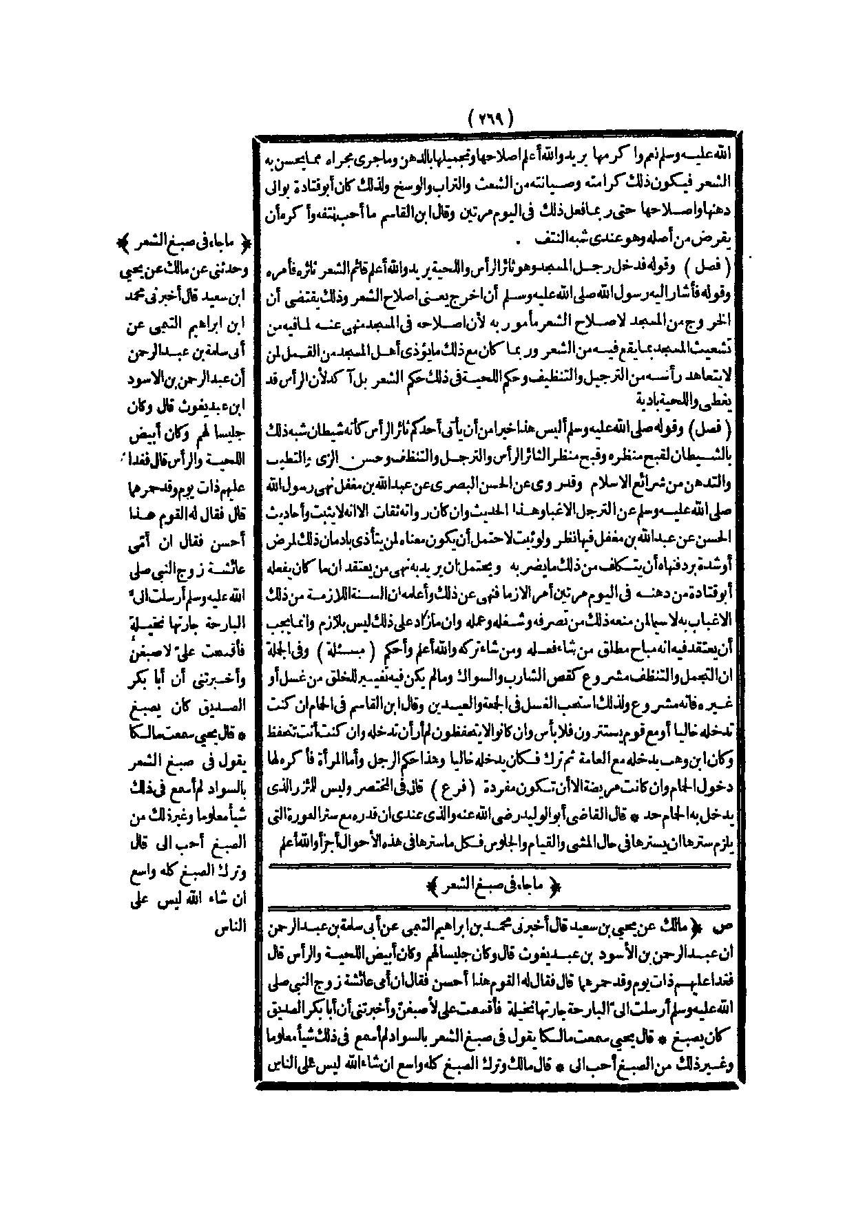 مَا جَاءَ فِي صَبْغِ الشَّعْرِ (ص) : (مَالِكٌ عَنْ يَحْيَى بْنِ سَعِيدٍ قَالَ: أَخْبَرَنِي مُحَمَّدُ بْنُ إبْرَاهِيمَ التَّيْمِيُّ عَنْ أَبِي سَلَمَةَ بْنِ عَبْدِ الرَّحْمَنِ أَنَّ عَبْدَ الرَّحْمَنِ بْنَ الْأَسْوَدِ بْنِ عَبْدِ يَغُوثَ قَالَ: وَكَانَ جَلِيسًا لَهُمْ وَكَانَ أَبْيَضَ اللِّحْيَةِ وَالرَّأْسِ قَالَ: فَغَدَا عَلَيْهِمْ ذَاتَ يَوْمٍ وَقَدْ حَمَّرَهُمَا قَالَ: فَقَالَ: لَهُ الْقَوْمُ هَذَا أَحْسَنُ فَقَالَ: إنَّ أُمِّيَ عَائِشَةَ زَوْجَ النَّبِيِّ - صَلَّى اللَّهُ عَلَيْهِ وَسَلَّمَ - أَرْسَلَتْ إلَيَّ الْبَارِحَةَ جَارَتَهَا نُخَيْلَةَ فَأَقْسَمَتْ عَلَيَّ لَأَصْبِغَنَّ وَأَخْبَرَتْنِي أَنَّ أَبَا بَكْرٍ الصِّدِّيقَ كَانَ يَصْبُغُ قَالَ: يَحْيَى سَمِعْت مَالِكًا يَقُولُ فِي صَبْغِ الشَّعْرِ بِالسَّوَادِ لَمْ أَسْمَعْ فِي ذَلِكَ شَيْئًا مَعْلُومًا وَغَيْرُ ذَلِكَ مِنْ الصَّبْغِ أَحَبُّ إلَيَّ قَالَ: مَالِكٌ وَتَرْكُ الصَّبْغِ كُلِّهِ وَاسِعٌ إنْ شَاءَ اللَّهُ لَيْسَ عَلَى النَّاسِ
