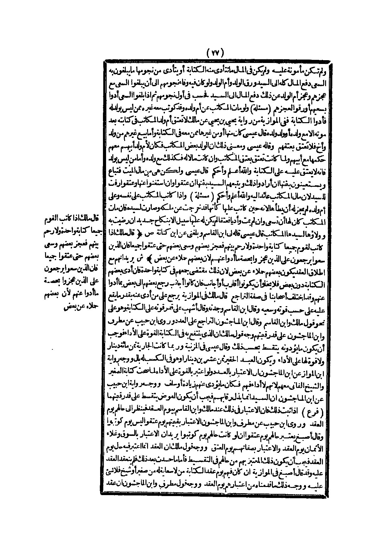 وَقَالَ ابْنُ الْقَاسِمِ وَجِدَّتِهِ وَقَالَ أَشْهَبُ عَلَى قَدْرِ قُوَّتِهِ عَلَى الْكِتَابَةِ وَهُوَ عَلَى نَحْوِ قَوْلِ مَالِكٍ وَابْنِ الْقَاسِمِ وَقَالَ ابْنُ الْمَاجِشُونِ التَّرَاجُعُ عَلَى الْعَدَدِ وَرَوَى ابْنُ حَبِيبٍ عَنْ مُطَرِّفٍ وَابْنِ الْمَاجِشُونِ عَلَى قَدْرِ قِيمَتِهِمْ، وَجْهُ قَوْلِ مَالِكٍ أَنَّ الَّذِي يَنْتَفِعُ بِهِ فِي الْكِتَابَةِ الْقُوَّةُ عَلَى الْأَدَاءِ فَوَجَبَ أَنْ يَكُونَ مَا يُؤَدُّونَهُ يَتَقَسَّطُ بِحَسَبِ ذَلِكَ.