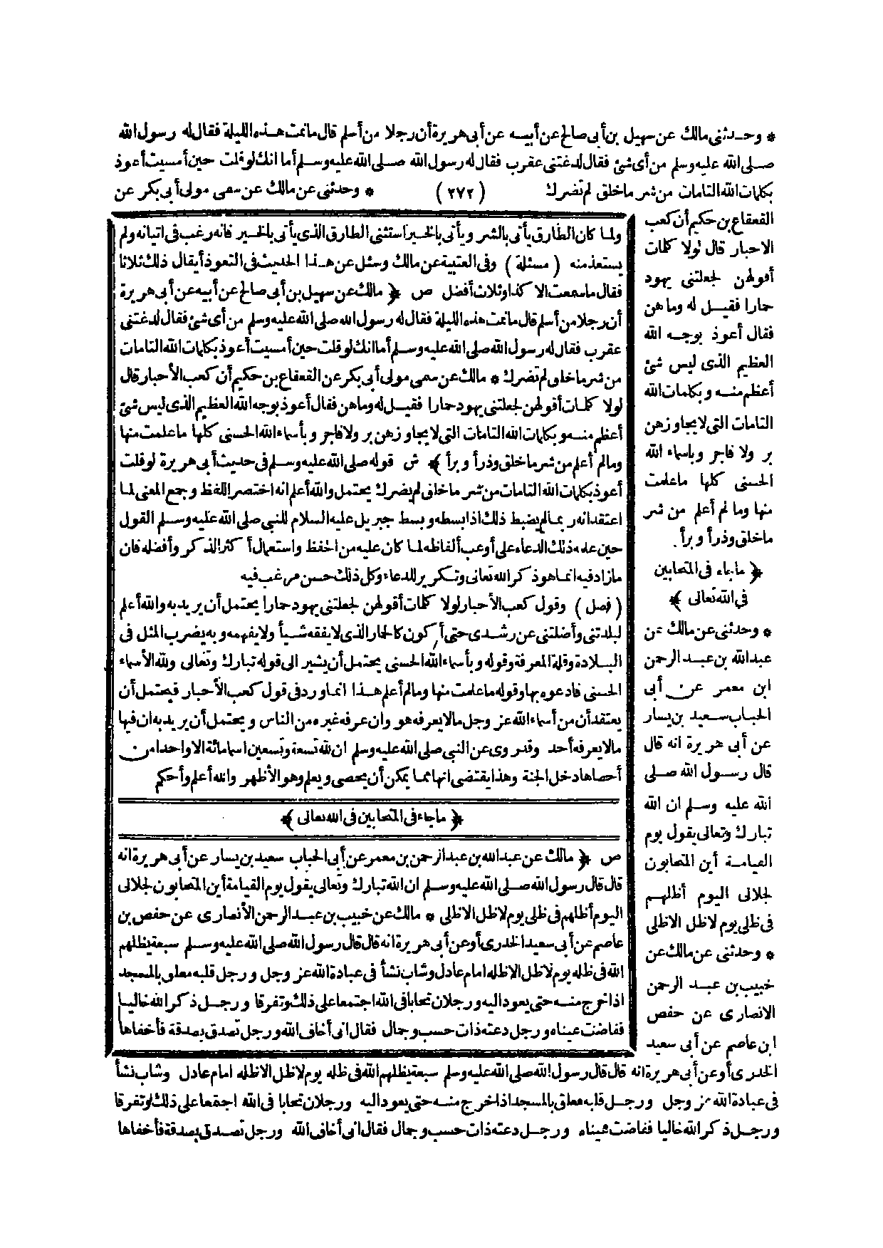 (ص) : (مَالِكٌ عَنْ عَبْدِ اللَّهِ بْنِ عَبْدِ الرَّحْمَنِ بْنِ مَعْمَرٍ عَنْ أَبِي الْحُبَابِ سَعِيدِ بْنِ يَسَارٍ عَنْ أَبِي هُرَيْرَةَ أَنَّهُ قَالَ: قَالَ: رَسُولُ اللَّهِ - صَلَّى اللَّهُ عَلَيْهِ وَسَلَّمَ - «إنَّ اللَّهَ تَبَارَكَ وَتَعَالَى يَقُولُ يَوْمَ الْقِيَامَةِ أَيْنَ الْمُتَحَابُّونَ لِجَلَالِي الْيَوْمَ أُظِلُّهُمْ فِي ظِلِّي يَوْمَ لَا ظِلَّ إلَّا ظِلِّي» مَالِكٌ عَنْ خُبَيْبِ بْنِ عَبْدِ الرَّحْمَنِ الْأَنْصَارِيِّ عَنْ حَفْصِ بْنِ عَاصِمٍ عَنْ أَبِي سَعِيدٍ الْخُدْرِيِّ، أَوْ عَنْ أَبِي هُرَيْرَةَ أَنَّهُ قَالَ: قَالَ: رَسُولُ اللَّهِ - صَلَّى اللَّهُ عَلَيْهِ وَسَلَّمَ - «سَبْعَةٌ يُظِلُّهُمْ اللَّهُ فِي ظِلِّهِ يَوْمَ لَا ظِلَّ إلَّا ظِلُّهُ إمَامٌ عَادِلٌ وَشَابٌّ نَشَأَ فِي عِبَادَةِ اللَّهِ عَزَّ وَجَلَّ وَرَجُلٌ قَلْبُهُ مُعَلَّقٌ بِالْمَسْجِدِ إذَا خَرَجَ مِنْهُ حَتَّى يَعُودَ إلَيْهِ وَرَجُلَانِ تَحَابَّا فِي اللَّهِ اجْتَمَعَا عَلَى ذَلِكَ وَتَفَرَّقَا وَرَجُلٌ ذَكَرَ اللَّهَ خَالِيًا فَفَاضَتْ عَيْنَاهُ وَرَجُلٌ دَعَتْهُ ذَاتُ حَسَبٍ وَجَمَالٍ فَقَالَ: إنِّي أَخَافُ اللَّهَ وَرَجُلٌ تَصَدَّقَ بِصَدَقَةٍ فَأَخْفَاهَا