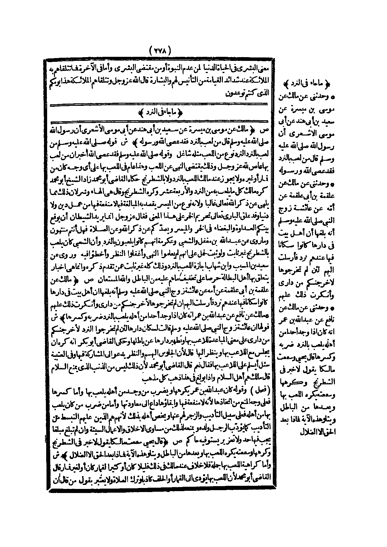 مَا جَاءَ فِي النَّرْدِ (ص) : (مَالِكٌ عَنْ مُوسَى بْنِ مَيْسَرَةَ عَنْ سَعِيدِ بْنِ أَبِي هِنْدٍ عَنْ أَبِي مُوسَى الْأَشْعَرِيِّ أَنَّ رَسُولَ اللَّهِ - صَلَّى اللَّهُ عَلَيْهِ وَسَلَّمَ - قَالَ «مَنْ لَعِبَ بِالنَّرْدِ فَقَدْ عَصَى اللَّهَ وَرَسُولَهُ» .