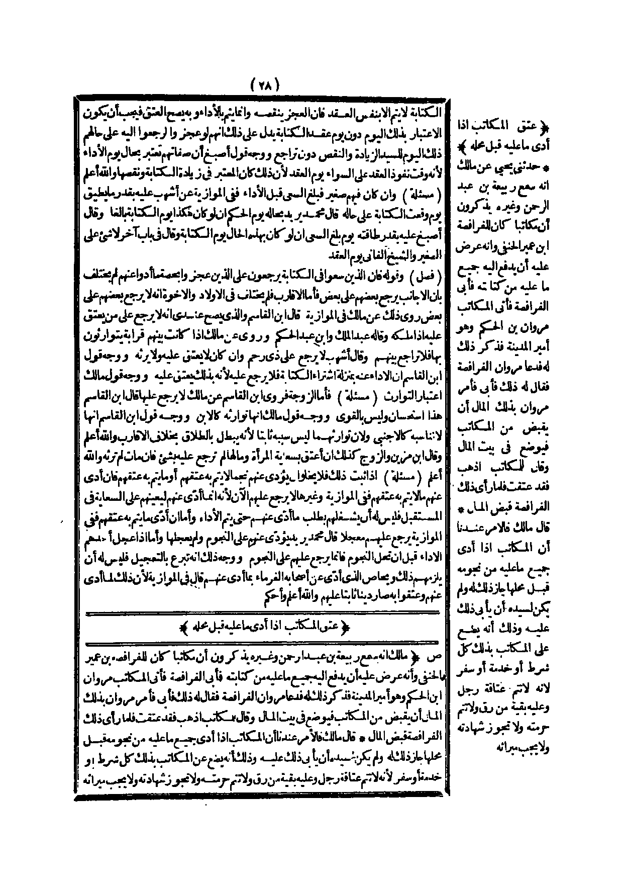 عِتْقُ الْمُكَاتَبِ إذَا أَدَّى مَا عَلَيْهِ قَبْلَ مَحِلِّهِ (ص) : (مَالِكٌ أَنَّهُ سَمِعَ رَبِيعَةَ بْنَ عَبْدِ الرَّحْمَنِ وَغَيْرَهُ يَذْكُرُونَ أَنَّ مُكَاتَبًا كَانَ لِلرَّافِضَةِ بْنِ عُمَيْرٍ الْحَنَفِيِّ وَأَنَّهُ عَرَضَ عَلَيْهِ أَنْ يَدْفَعَ إلَيْهِ جَمِيعَ مَا عَلَيْهِ مِنْ كِتَابَتِهِ فَأَبَى الْفُرَافِصَةُ فَأَتَى الْمُكَاتَبُ مَرْوَانَ بْنَ الْحَكَمِ وَهُوَ أَمِيرُ الْمَدِينَةِ فَذَكَرَ ذَلِكَ فَدَعَا مَرْوَانُ الْفُرَافِصَةَ فَقَالَ لَهُ ذَلِكَ فَأَبَى فَأَمَرَ مَرْوَانُ بِذَلِكَ الْمَالِ أَنْ يُقْبَضَ مِنْ الْمُكَاتَبِ فَيُوضَعَ فِي بَيْتِ الْمَالِ وَقَالَ لِلْمُكَاتَبِ اذْهَبْ فَقَدْ عَتَقْت فَلَمَّا رَأَى ذَلِكَ الْفُرَافِصَةُ قَبَضَ الْمَالَ قَالَ مَالِكٌ فَالْأَمْرُ عِنْدَنَا أَنَّ الْمُكَاتَبَ إذَا أَدَّى جَمِيعَ مَا عَلَيْهِ مِنْ نُجُومِهِ قَبْلَ مَحِلِّهَا جَازَ ذَلِكَ لَهُ وَلَمْ يَكُنْ لِسَيِّدِهِ أَنْ يَأْبَى ذَلِكَ عَلَيْهِ وَذَلِكَ أَنَّهُ يَضَعُ عَنْ الْمُكَاتَبِ بِذَلِكَ كُلَّ شَرْطٍ أَوْ خِدْمَةٍ أَوْ سَفَرٍ؛ لِأَنَّهُ لَا تَتِمُّ عَتَاقَةُ رَجُلٍ وَعَلَيْهِ بَقِيَّةٌ مِنْ رِقٍّ وَلَا تَتِمُّ حُرْمَتُهُ وَلَا تَجُوزُ شَهَادَتُهُ وَلَا يَجِبُ مِيرَاثُهُ
