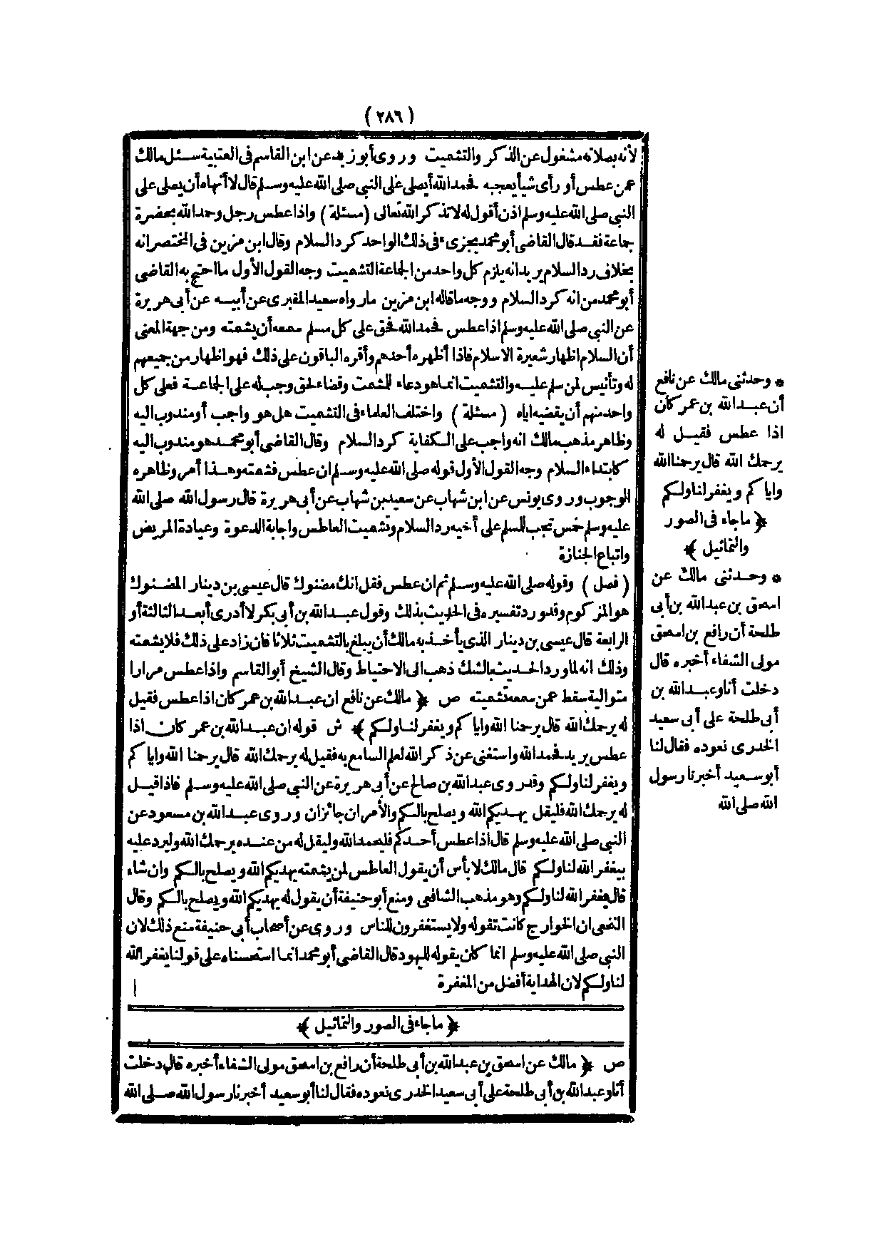 مَا جَاءَ فِي الصُّوَرِ وَالتَّمَاثِيلِ (ص) : (مَالِكٌ عَنْ إِسْحَاقَ بْنِ عَبْدِ اللَّهِ بْنِ أَبِي طَلْحَةَ أَنَّ رَافِعَ بْنَ إِسْحَاقَ مَوْلَى الشِّفَاءِ أَخْبَرَهُ قَالَ «دَخَلْت أَنَا وَعَبْدُ اللَّهِ بْنُ طَلْحَةَ عَلَى أَبِي سَعِيدٍ الْخُدْرِيِّ نَعُودُهُ فَقَالَ لَنَا أَبُو سَعِيدٍ: أَخْبَرَنَا رَسُولُ اللَّهِ - صَلَّى اللَّهُ عَلَيْهِ وَسَلَّمَ -