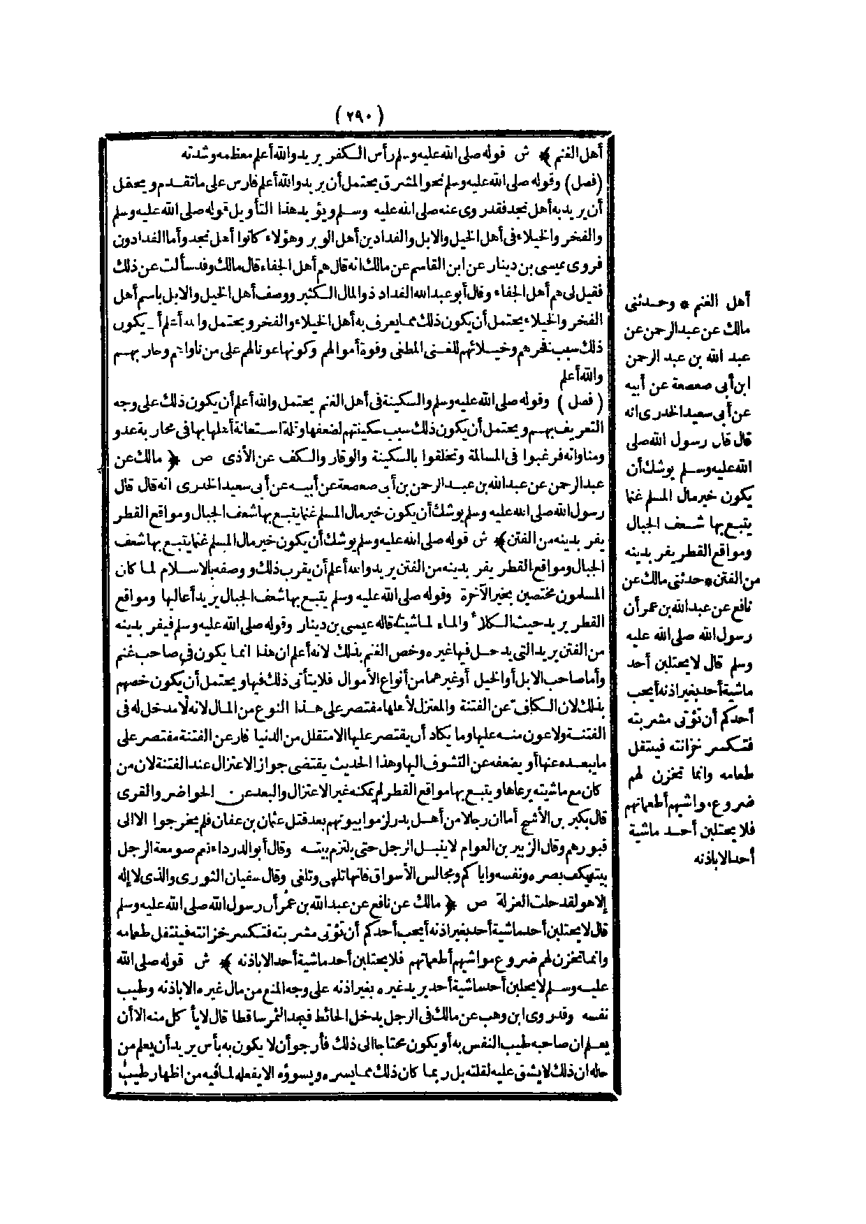 (ص) : (مَالِكٌ عَنْ عَبْدِ الرَّحْمَنِ عَنْ عَبْدِ اللَّهِ بْنِ عَبْدِ الرَّحْمَنِ بْنِ أَبِي صَعْصَعَةَ عَنْ أَبِيهِ عَنْ أَبِي سَعِيدٍ الْخُدْرِيِّ أَنَّهُ قَالَ قَالَ رَسُولُ اللَّهِ - صَلَّى اللَّهُ عَلَيْهِ وَسَلَّمَ - «يُوشِكُ أَنْ يَكُونَ خَيْرُ مَالِ الْمُسْلِمِ غَنَمًا يَتْبَعُ بِهَا شَعَفَ الْجِبَالِ وَمَوَاقِعَ الْقَطْرِ يَفِرُّ بِدِينِهِ مِنْ الْفِتَنِ» شُ قَوْلُهُ - صَلَّى اللَّهُ عَلَيْهِ وَسَلَّمَ - «يُوشِكُ أَنْ يَكُونَ خَيْرُ مَالِ الْمُسْلِمِ غَنَمًا يَتْبَعُ بِهَا شَعَفَ الْجِبَالِ وَمَوَاقِعَ الْقَطْرِ يَفِرُّ بِدِينِهِ مِنْ الْفِتَنِ» يُرِيدُ - وَاَللَّهُ أَعْلَمُ - أَنْ يَقْرَبَ ذَلِكَ وَوَصَفَهُ بِالْإِسْلَامِ لَمَّا كَانَ الْمُسْلِمُونَ مُخْتَصِّينَ بِخَيْرِ الْآخِرَةِ، وَقَوْلُهُ - صَلَّى اللَّهُ عَلَيْهِ وَسَلَّمَ - «يَتْبَعُ بِهَا شَعَفَ الْجِبَالِ يُرِيدُ أَعَالِيَهَا وَمَوَاقِعَ الْقَطْرَ يُرِيدُ حَيْثُ الْكَلَأُ» وَالْمَاءُ لِمَاشِيَتِهِ قَالَهُ عِيسَى بْنُ دِينَارٍ وَقَوْلُهُ - صَلَّى اللَّهُ عَلَيْهِ وَسَلَّمَ - «يَفِرُّ بِدِينِهِ مِنْ الْفِتَنِ» يُرِيدُ الَّتِي يَدْخُلُ فِيهَا غَيْرُهُ وَخَصَّ الْغَنَمَ بِذَلِكَ؛ لِأَنَّهُ أَعْلَمُ أَنَّ هَذَا إنَّمَا يَكُونُ فِي صَاحِبِ غَنَمٍ وَأَمَّا صَاحِبُ الْإِبِلِ أَوْ الْخَيْلِ أَوْ غَيْرِهِمَا مِنْ أَنْوَاعِ الْأَمْوَالِ فَلَا يَتَأَتَّى ذَلِكَ فِيهَا، وَيُحْتَمَلُ أَنْ يَكُونَ خَصَّهُمْ بِذَلِكَ؛ لِأَنَّ الْكَافَّ عَنْ الْفِتْنَةِ وَالْمُعْتَزِلَ لِأَهْلِهَا مُقْتَصِرٌ عَلَى هَذَا النَّوْعِ مِنْ الْمَالِ؛ لِأَنَّهُ لَا مَدْخَلَ لَهُ فِي الْفِتْنَةِ وَلَا عَوْنَ مِنْهُ عَلَيْهَا وَمَا يَكَادُ أَنْ يَقْتَصِرَ عَلَيْهَا إلَّا مُتَقَلِّلٌ مِنْ الدُّنْيَا، فَأَرْعَنُ الْفِتْنَةِ مُقْتَصِرٌ عَلَى مَا يُبْعِدُهُ عَنْهَا أَوْ يُضْعِفُهُ عَنْ التَّشَوُّفِ إلَيْهَا وَهَذَا الْحَدِيثُ يَقْتَضِي جَوَازَ الِاعْتِزَالِ عِنْدَ الْفِتْنَةِ؛ لِأَنَّ مَنْ كَانَ مَعَ مَاشِيَتِهِ يَرْعَاهَا وَيَتْبَعُ بِهَا مَوَاقِعَ الْقَطْرِ لَمْ يُمْكِنْهُ غَيْرُ الِاعْتِزَالِ وَالْبَعْدُ عَنْ الْحَوَاضِرِ وَالْقُرَى، قَالَ بُكَيْر بْنُ الْأَشَجِّ أَمَا أَنَّ رِجَالًا مِنْ أَهْلِ بَدْرٍ لَزِمُوا بُيُوتَهُمْ بَعْدَ قَتْلِ عُثْمَانَ بْنِ عَفَّانَ فَلَمْ يَخْرُجُوا إلَّا إلَى قُبُورِهِمْ وَقَالَ الزُّبَيْرُ بْنُ الْعَوَامّ لَا يَنْبُلُ الرَّجُلُ حَتَّى يَلْتَزِمَ بَيْتَهُ. وَقَالَ أَبُو الدَّرْدَاءِ نَعَمْ صَوْمَعَةُ الرَّجُلِ بَيْتُهُ يَكُفُّ بَصَرَهُ وَنَفْسَهُ وَإِيَّاكُمْ وَمَجَالِسَ الْأَسْوَاقِ فَإِنَّهَا تُلْهِي وَتُلْغِي وَقَالَ سُفْيَانُ الثَّوْرِيُّ وَاَلَّذِي لَا إلَهَ إلَّا هُوَ لَقَدْ حَلَّتْ الْعُزْلَةُ.