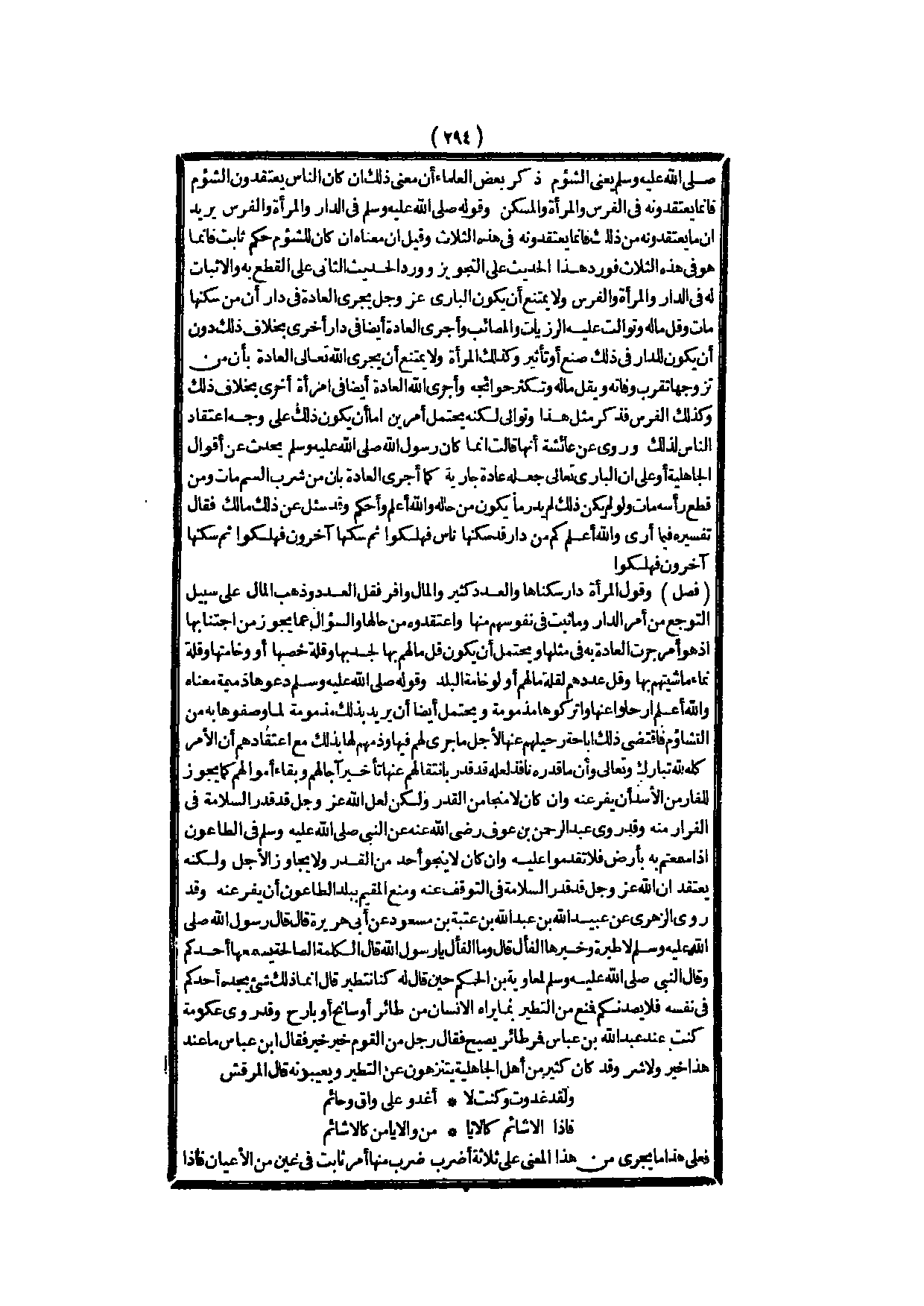ـــــــــــــــــــــــــــــQ- صَلَّى اللَّهُ عَلَيْهِ وَسَلَّمَ - يَعْنِي الشُّؤْمَ ذَكَرَ بَعْضُ الْعُلَمَاءِ أَنَّ مَعْنَى ذَلِكَ إنْ كَانَ النَّاسُ يَعْتَقِدُونَ الشُّؤْمَ فَإِنَّمَا يَعْتَقِدُونَهُ فِي الْفَرَسِ وَالْمَرْأَةِ وَالْمَسْكَنِ وَقَوْلُهُ - صَلَّى اللَّهُ عَلَيْهِ وَسَلَّمَ - فِي الدَّارِ وَالْمَرْأَةِ وَالْفَرَسِ يُرِيدُ أَنَّ مَا يَعْتَقِدُونَهُ مِنْ ذَلِكَ فَإِنَّمَا يَعْتَقِدُونَهُ فِي هَذِهِ الثَّلَاثِ وَقِيلَ: إنَّ مَعْنَاهُ إنْ كَانَ لِلشُّؤْمِ حُكْمٌ ثَابِتٌ فَإِنَّمَا هُوَ فِي هَذِهِ الثَّلَاثِ فَوَرَدَ هَذَا الْحَدِيثُ عَلَى التَّجْوِيزِ وَوَرَدَ الْحَدِيثُ الثَّانِي عَلَى الْقَطْعِ بِهِ وَالْإِثْبَاتِ لَهُ فِي الدَّارِ وَالْمَرْأَةِ وَالْفَرَسِ وَلَا يَمْتَنِعُ أَنْ يَكُونَ الْبَارِي - عَزَّ وَجَلَّ - يُجْرِي الْعَادَةَ فِي دَارٍ أَنَّ مَنْ سَكَنَهَا مَاتَ وَقَلَّ مَالُهُ وَتَوَالَتْ عَلَيْهِ الرَّزِيَّاتُ وَالْمَصَائِبُ وَأَجْرَى الْعَادَةَ أَيْضًا فِي دَارٍ أُخْرَى بِخِلَافِ ذَلِكَ دُونَ أَنْ يَكُونَ لِلدَّارِ فِي ذَلِكَ صُنْعٌ أَوْ تَأْثِيرٌ وَكَذَلِكَ الْمَرْأَةُ وَلَا يَمْتَنِعُ أَنْ يَجْرِيَ اللَّهُ تَعَالَى الْعَادَةَ بِأَنَّ مَنْ تَزَوَّجَهَا تَقْرُبُ وَفَاتُهُ وَيَقِلُّ مَالُهُ وَتَكْثُرُ حَوَائِجُهُ، وَأَجْرَى اللَّهُ الْعَادَةَ أَيْضًا فِي امْرَأَةٍ أُخْرَى بِخِلَافِ ذَلِكَ وَكَذَلِكَ الْفَرَسُ فَذَكَرَ مِثْلَ هَذَا وَتَوَالَى لَكِنَّهُ يَحْتَمِلُ أَمْرَيْنِ إمَّا أَنْ يَكُونَ ذَلِكَ عَلَى وَجْهِ اعْتِقَادِ النَّاسِ لِذَلِكَ.
