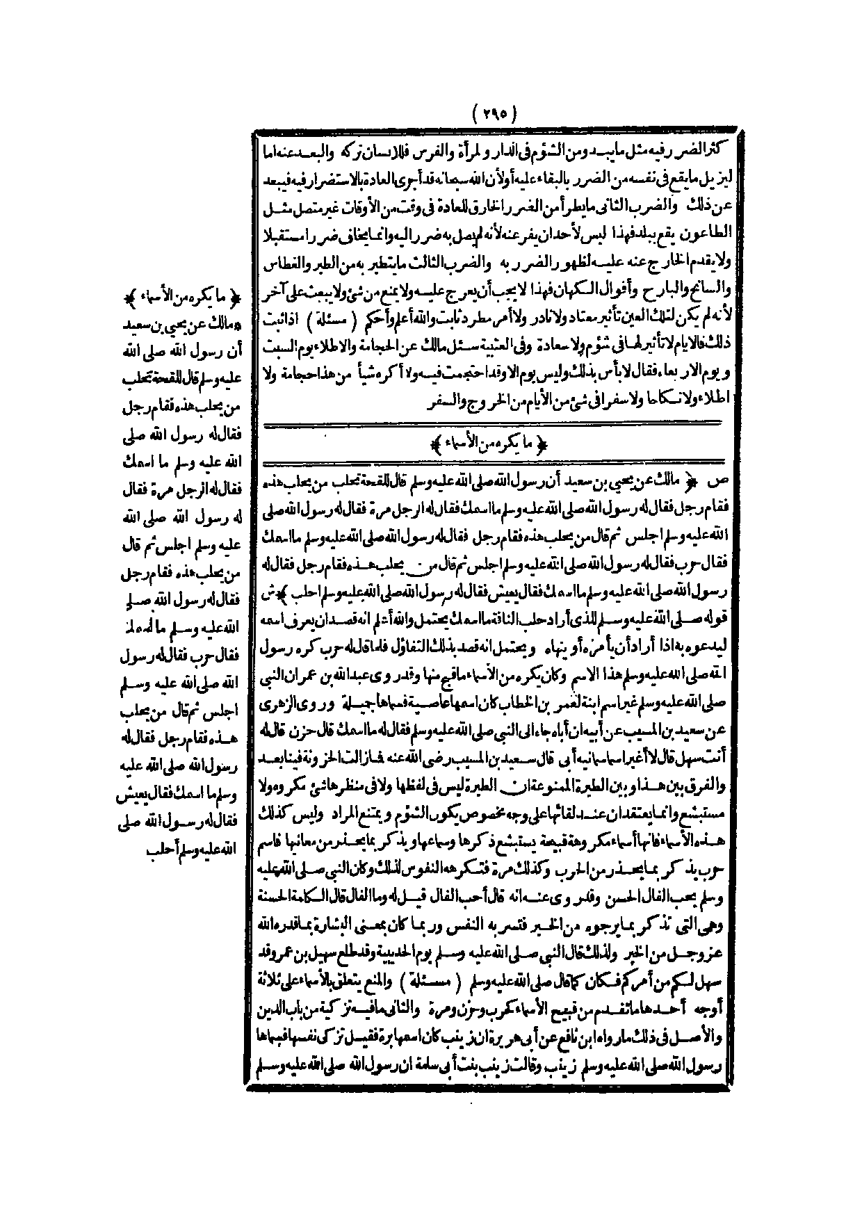 مَا يُكْرَهُ مِنْ الْأَسْمَاءِ (ص) : (مَالِكٌ عَنْ يَحْيَى بْنِ سَعِيدٍ «أَنَّ رَسُولَ اللَّهِ - صَلَّى اللَّهُ عَلَيْهِ وَسَلَّمَ - قَالَ لَلِقْحَةٌ تُحْلَبُ مَنْ يَحْلُبُ هَذِهِ فَقَامَ رَجُلٌ فَقَالَ لَهُ رَسُولُ اللَّهِ - صَلَّى اللَّهُ عَلَيْهِ وَسَلَّمَ - مَا اسْمُك فَقَالَ لَهُ الرَّجُلُ مُرَّةُ فَقَالَ لَهُ رَسُولُ اللَّهِ - صَلَّى اللَّهُ عَلَيْهِ وَسَلَّمَ - اجْلِسْ ثُمَّ قَالَ مَنْ يَحْلُبُ هَذِهِ فَقَامَ رَجُلٌ فَقَالَ لَهُ رَسُولُ اللَّهِ - صَلَّى اللَّهُ عَلَيْهِ وَسَلَّمَ - مَا اسْمُك فَقَالَ حَرْبٌ فَقَالَ لَهُ رَسُولُ اللَّهِ - صَلَّى اللَّهُ عَلَيْهِ وَسَلَّمَ - اجْلِسْ ثُمَّ قَالَ مَنْ يَحْلُبُ هَذِهِ فَقَامَ رَجُلٌ فَقَالَ لَهُ رَسُولُ اللَّهِ - صَلَّى اللَّهُ عَلَيْهِ وَسَلَّمَ - مَا اسْمُك فَقَالَ يَعِيشُ فَقَالَ لَهُ رَسُولُ اللَّهِ - صَلَّى اللَّهُ عَلَيْهِ وَسَلَّمَ - اُحْلُبْ» )