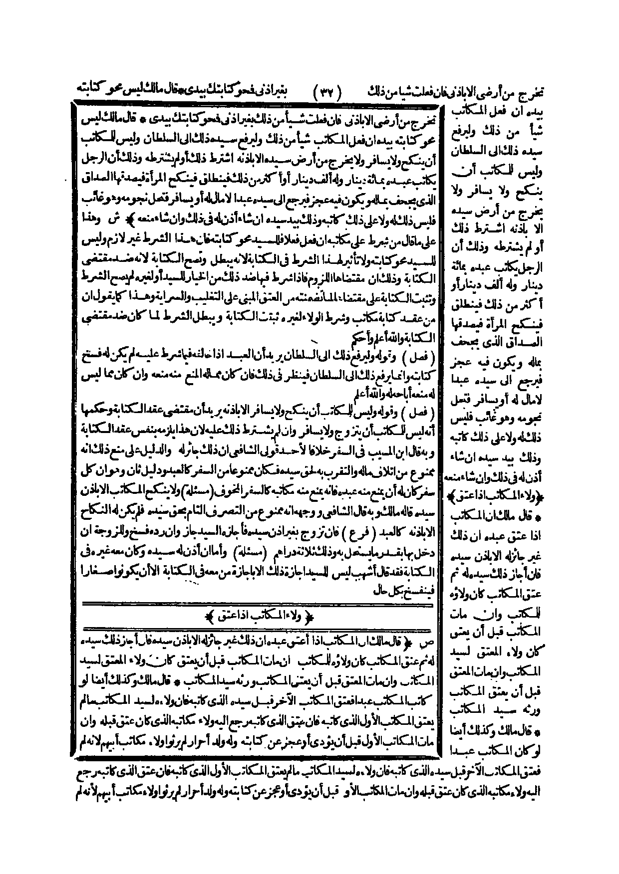 وَلَاءُ الْمُكَاتَبِ إذَا عَتَقَ (ص) : (قَالَ مَالِكٌ إنَّ الْمُكَاتَبَ إذَا أَعْتَقَ عَبْدَهُ أَنَّ ذَلِكَ غَيْرُ جَائِزٍ لَهُ إلَّا بِإِذْنِ سَيِّدِهِ فَإِنْ أَجَازَ ذَلِكَ سَيِّدُهُ لَهُ ثُمَّ عَتَقَ الْمُكَاتَبُ كَانَ وَلَاؤُهُ لِلْمُكَاتَبِ وَإِنْ مَاتَ الْمُكَاتَبُ قَبْلَ أَنْ يَعْتِقَ كَانَ وَلَاءُ الْمُعْتَقِ لِسَيِّدِ الْمُكَاتَبِ، وَإِنْ مَاتَ الْمُعْتَقُ قَبْلَ أَنْ يَعْتِقَ الْمُكَاتَبُ وَرِثَهُ سَيِّدُ الْمُكَاتَبِ قَالَ مَالِكٌ وَكَذَلِكَ أَيْضًا لَوْ كَاتَبَ الْمُكَاتَبُ عَبْدًا فَعَتَقَ الْمُكَاتَبُ الْآخَرُ قَبْلَ سَيِّدِهِ الَّذِي كَاتَبَهُ فَإِنَّ وَلَاءَهُ لِسَيِّدِ الْمُكَاتَبِ مَا لَمْ يَعْتِقْ الْمُكَاتَبُ الْأَوَّلُ الَّذِي كَاتَبَهُ فَإِنْ عَتَقَ الَّذِي كَاتَبَهُ رَجَعَ إلَيْهِ وَلَاءُ مُكَاتَبِهِ الَّذِي كَانَ عَتَقَ قَبْلَهُ، وَإِنْ مَاتَ الْمُكَاتَبُ الْأَوَّلُ قَبْلَ أَنْ يُؤَدِّيَ أَوْ عَجَزَ عَنْ كِتَابَتِهِ وَلَهُ وَلَدٌ أَحْرَارٌ لَمْ يَرِثُوا وَلَاءَ مُكَاتَبِ أَبِيهِمْ؛ لِأَنَّهُ لَمْ