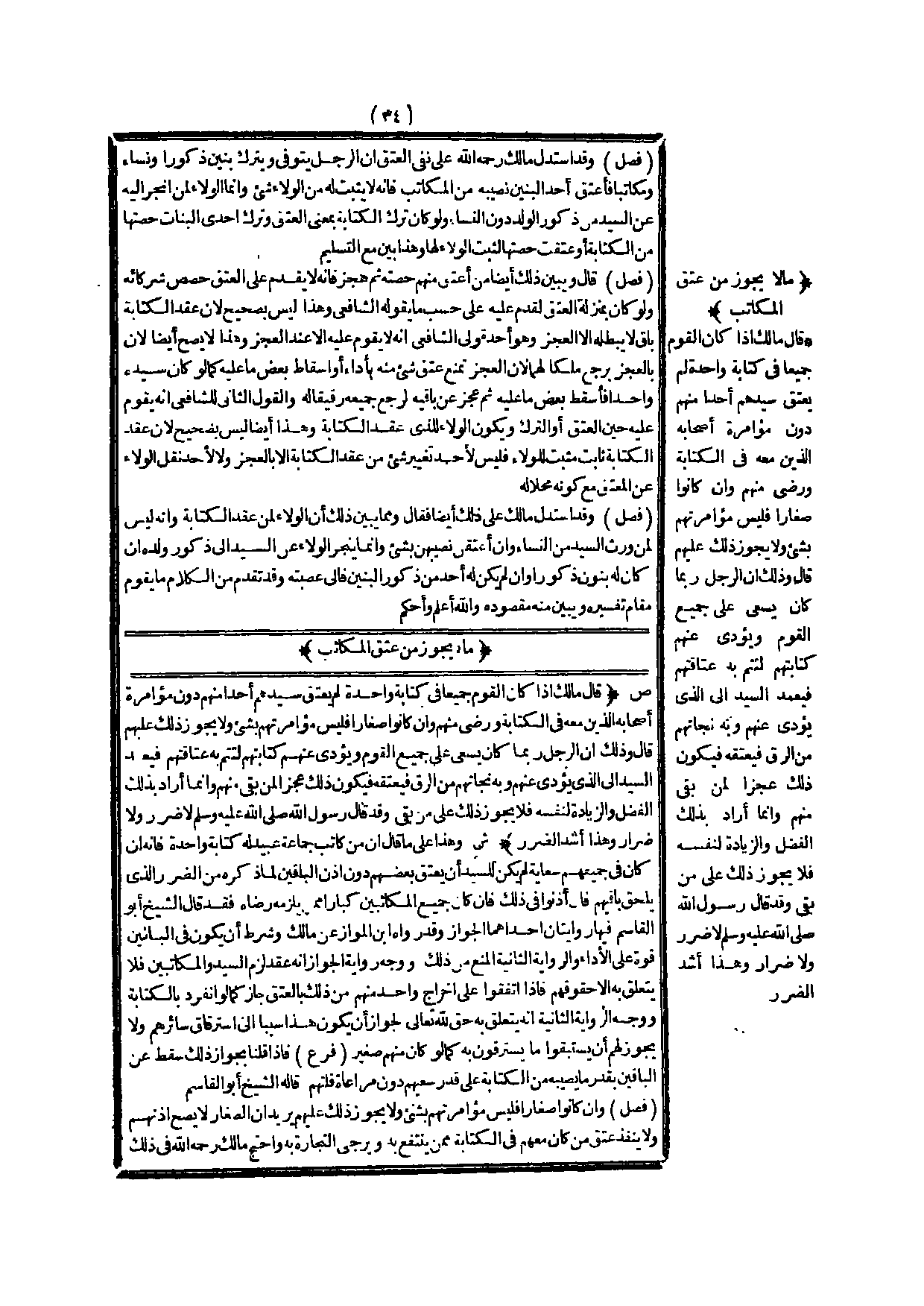 مَا لَا يَجُوزُ مِنْ عِتْقِ الْمُكَاتَبِ (ص) : (قَالَ مَالِكٌ إذَا كَانَ الْقَوْمُ جَمِيعًا فِي كِتَابَةٍ وَاحِدَةٍ لَمْ يُعْتِقْ سَيِّدُهُمْ أَحَدًا مِنْهُمْ دُونَ مُؤَامَرَةِ أَصْحَابِهِ الَّذِينَ مَعَهُ فِي الْكِتَابَةِ وَرِضًى مِنْهُمْ، وَإِنْ كَانُوا صِغَارًا فَلَيْسَ مُؤَامَرَتُهُمْ بِشَيْءٍ وَلَا يَجُوزُ ذَلِكَ عَلَيْهِمْ قَالَ وَذَلِكَ أَنَّ الرَّجُلَ رُبَّمَا كَانَ يَسْعَى عَلَى جَمِيعِ الْقَوْمِ وَيُؤَدِّي عَنْهُمْ كِتَابَتَهُمْ لِتَتِمَّ بِهِ عَتَاقَتُهُمْ فَيَعْمِدُ السَّيِّدُ إلَى الَّذِي يُؤَدِّي عَنْهُمْ وَبِهِ نَجَاتُهُمْ مِنْ الرِّقِّ فَيُعْتِقُهُ فَيَكُونُ ذَلِكَ عَجْزًا لِمَنْ بَقِيَ مِنْهُمْ وَإِنَّمَا أَرَادَ بِذَلِكَ الْفَضْلَ وَالزِّيَادَةَ لِنَفْسِهِ فَلَا يَجُوزُ ذَلِكَ عَلَى مَنْ بَقِيَ وَقَدْ قَالَ رَسُولُ اللَّهِ - صَلَّى اللَّهُ عَلَيْهِ وَسَلَّمَ - «لَا ضَرَرَ وَلَا ضِرَارَ» وَهَذَا أَشَدُّ الضَّرَرِ)
