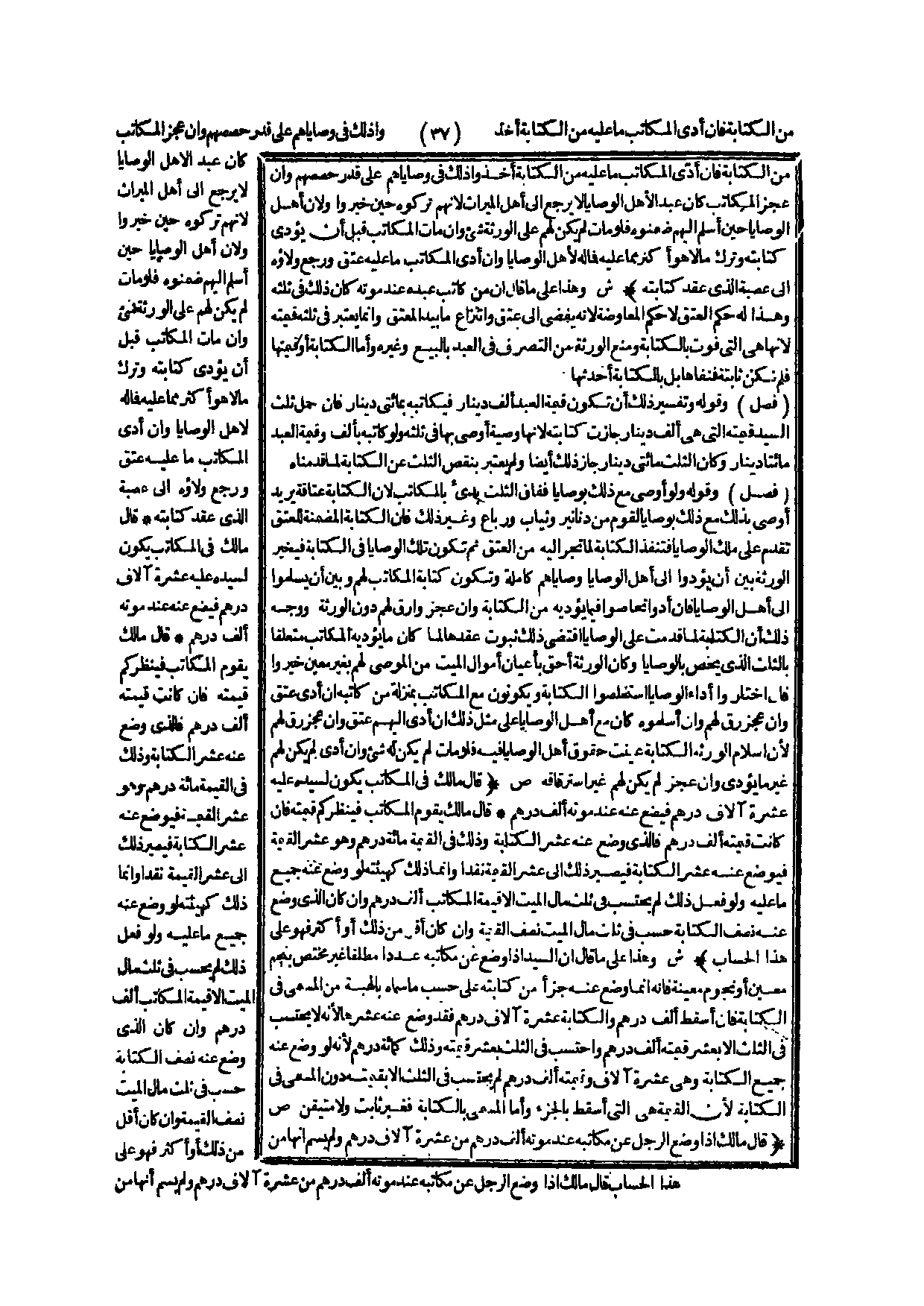 مِنْ الْكِتَابَةِ فَإِنْ أَدَّى الْمُكَاتَبُ مَا عَلَيْهِ مِنْ الْكِتَابَةِ أَخَذُوا ذَلِكَ فِي وَصَايَاهُمْ عَلَى قَدْرِ حِصَصِهِمْ وَإِنْ عَجَزَ الْمُكَاتَبُ كَانَ عَبْدًا لِأَهْلِ الْوَصَايَا لَا يَرْجِعُ إلَى أَهْلِ الْمِيرَاثِ لِأَنَّهُمْ تَرَكُوهُ حِينَ خُيِّرُوا؛ وَلِأَنَّ أَهْلَ الْوَصَايَا حِينَ أُسْلِمَ إلَيْهِمْ ضَمِنُوهُ فَلَوْ مَاتَ لَمْ يَكُنْ لَهُمْ عَلَى الْوَرَثَةِ شَيْءٌ وَإِنْ مَاتَ الْمُكَاتَبُ قَبْلَ أَنْ يُؤَدِّيَ كِتَابَتَهُ وَتَرَكَ مَالًا هُوَ أَكْثَرُ مِمَّا عَلَيْهِ فَمَالُهُ لِأَهْلِ الْوَصَايَا وَإِنْ أَدَّى الْمُكَاتَبُ مَا عَلَيْهِ عَتَقَ وَرَجَعَ وَلَاؤُهُ إلَى عَصَبَةِ الَّذِي عَقَدَ كِتَابَتَهُ) .