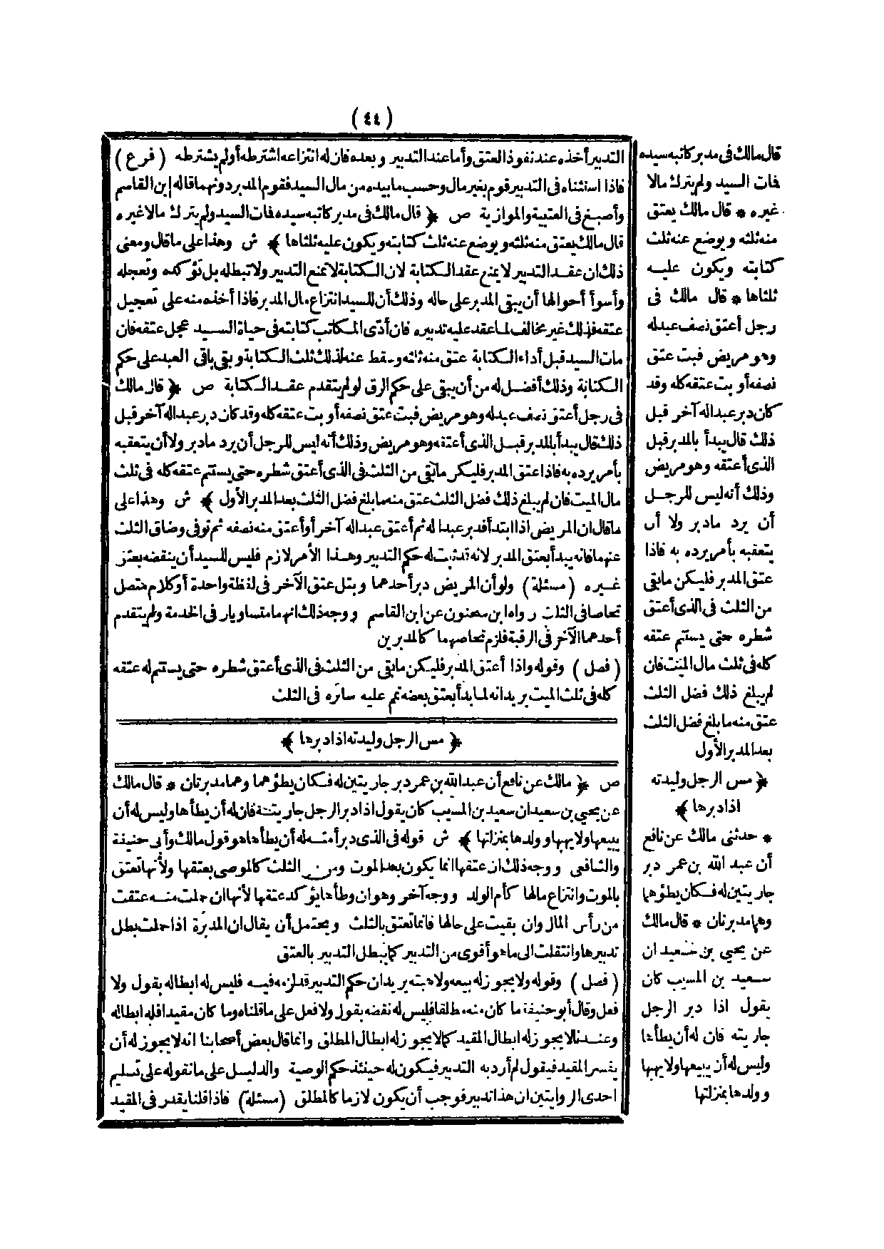 مَسُّ الرَّجُلِ وَلِيدَتِهِ إذَا دَبَّرَهَا (ص) : (مَالِكٌ عَنْ نَافِعٍ أَنَّ عَبْدَ اللَّهِ بْنَ عُمَرَ دَبَّرَ جَارِيَتَيْنِ لَهُ فَكَانَ يَطَؤُهُمَا وَهُمَا مُدَبَّرَتَانِ قَالَ مَالِكٌ عَنْ يَحْيَى بْنِ سَعِيدٍ إنَّ سَعِيدَ بْنَ الْمُسَيِّبِ كَانَ يَقُولُ إذَا دَبَّرَ الرَّجُلُ جَارِيَتَهُ فَإِنَّ لَهُ أَنْ يَطَأَهَا وَلَيْسَ لَهُ أَنْ يَبِيعَهَا وَلَا يَهَبَهَا وَوَلَدُهَا بِمَنْزِلَتِهَا) .