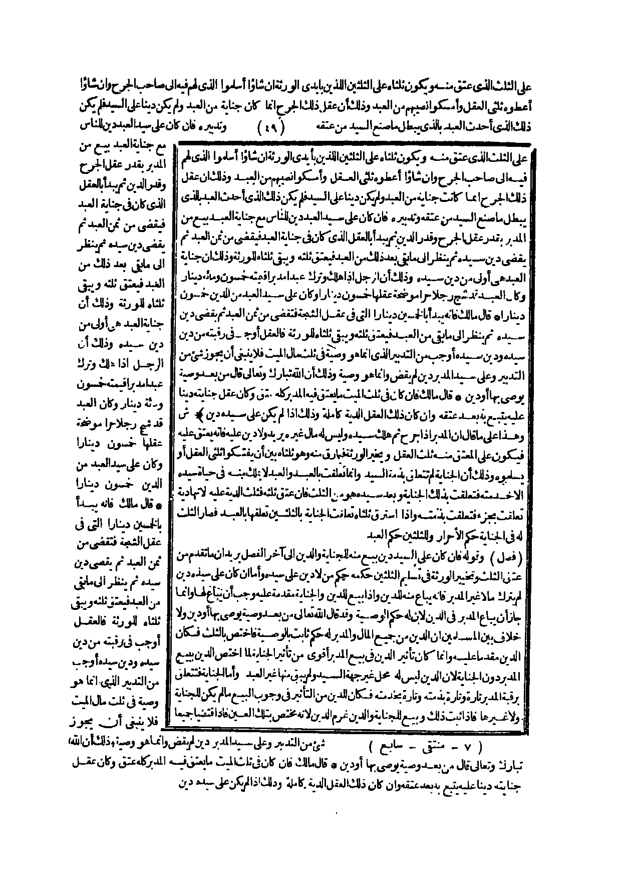ـــــــــــــــــــــــــــــQ (ش) : وَهَذَا عَلَى مَا قَالَ إنَّ الْمُدَبَّرَ إذَا جَرَحَ، ثُمَّ هَلَكَ سَيِّدُهُ وَلَيْسَ لَهُ مَالٌ غَيْرَهُ يُرِيدُ وَلَا دَيْنٌ عَلَيْهِ فَإِنَّهُ يَعْتِقُ عَلَيْهِ فَيَكُونُ عَلَى الْمُعْتَقِ مِنْهُ ثُلُثُ الْعَقْلِ وَيُخَيَّرُ الْوَرَثَةُ فِيمَا رَقَّ مِنْهُ وَهُوَ ثُلُثَاهُ بَيْنَ أَنْ يَفْتَكُّوا ثُلُثَيْ الْعَقْلِ أَوْ يُسَلِّمُوهُ، وَذَلِكَ أَنَّ الْجِنَايَةَ لَمْ تَتَعَلَّقْ بِذِمَّةِ السَّيِّدِ وَإِنَّمَا تَعَلَّقَتْ بِالْعَبْدِ وَالْعَبْدُ لَا يَمْلِكُ مِنْهُ فِي حَيَاةِ سَيِّدِهِ إلَّا خِدْمَتَهُ فَتَعَلَّقَتْ بِذَلِكَ الْجِنَايَةُ وَبَعُدَ سَيِّدُهُ هُوَ مِنْ الثُّلُثِ فَإِنْ عَتَقَ ثُلُثُهُ فَثُلُثُ الدِّيَةِ عَلَيْهِ؛ لِأَنَّهَا دِيَةٌ تَعَلَّقَتْ بِجُزْءٍ فَتَعَلَّقَتْ بِذِمَّتِهِ وَإِذَا اسْتَرَقَّ ثُلُثَاهُ تَعَلَّقَتْ الْجِنَايَةُ بِالثُّلُثَيْنِ تَعَلُّقَهَا بِالْعَبْدِ فَصَارَ الثُّلُثُ لَهُ فِي الْجِنَايَةِ حُكْمُ الْأَحْرَارِ وَلِلثُّلُثَيْنِ حُكْمُ الْعَبْدِ.
