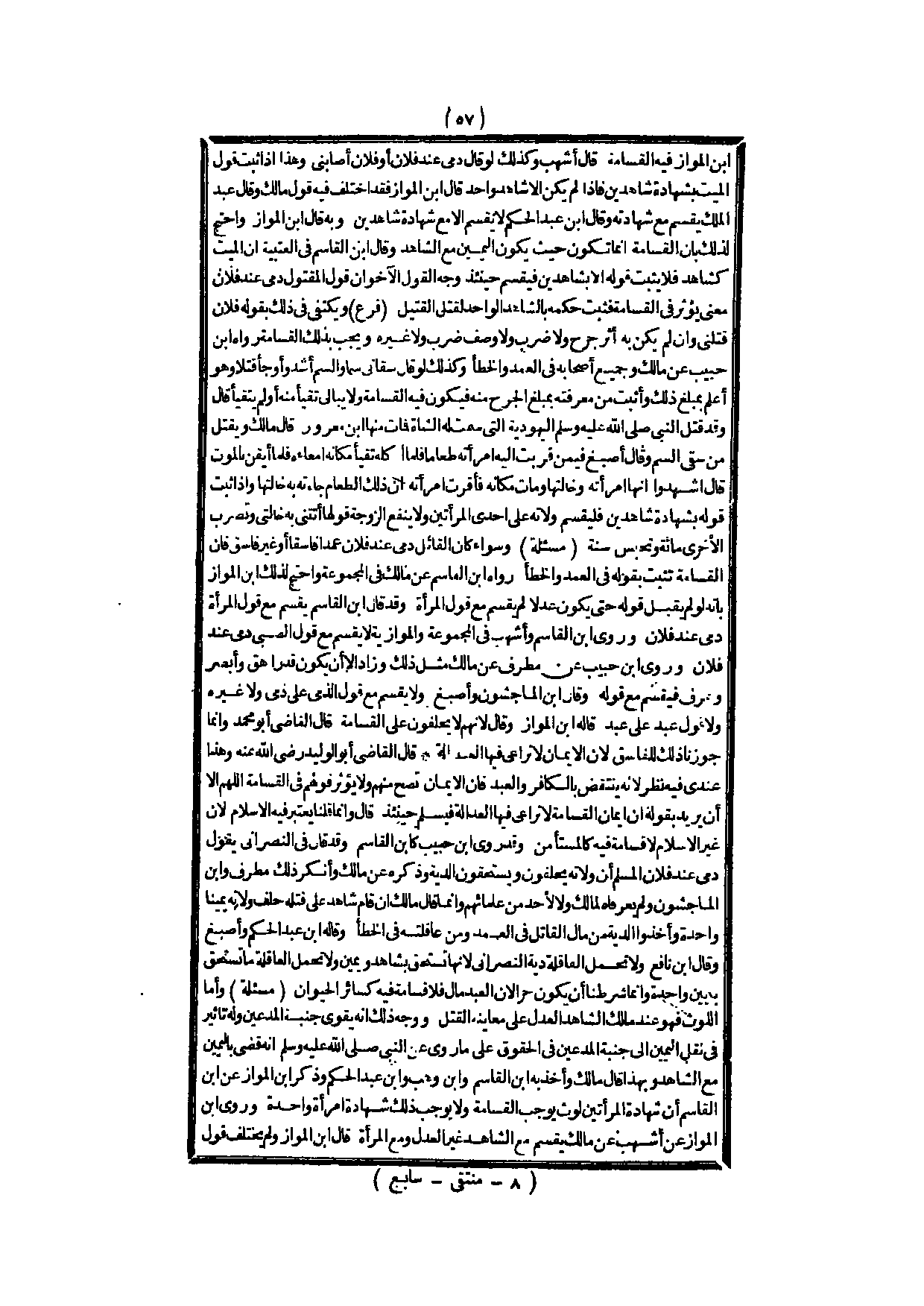 وَقَالَ ابْنُ الْمَاجِشُونِ وَأَصْبَغُ وَلَا يُقْسِمُ مَعَ قَوْلِ الذِّمِّيِّ عَلَى ذِمِّيٍّ وَلَا غَيْرِهِ وَلَا قَوْلِ عَبْدٍ عَلَى عَبْدٍ قَالَهُ ابْنُ الْمَوَّازِ وَقَالَ لِأَنَّهُمْ لَا يَحْلِفُونَ عَلَى الْقَسَامَةِ قَالَ الْقَاضِي أَبُو مُحَمَّدٍ وَإِنَّمَا جَوَّزْنَا ذَلِكَ لِلْفَاسِقِ؛ لِأَنَّ الْأَيْمَانَ لَا تُرَاعَى فِيهَا الْعَدَالَةُ قَالَ الْقَاضِي أَبُو الْوَلِيدِ - رَضِيَ اللَّهُ عَنْهُ - وَهَذَا عِنْدِي فِيهِ نَظَرٌ؛ لِأَنَّهُ يُنْتَقَضُ بِالْكَافِرِ وَالْعَبْدِ فَإِنَّ الْأَيْمَانَ تَصِحُّ مِنْهُمْ وَلَا يُؤَثِّرُ قَوْلُهُمْ فِي الْقَسَامَةِ اللَّهُمَّ إلَّا أَنْ يُرِيدَ بِقَوْلِهِ أَنَّ أَيْمَانَ الْقَسَامَةِ لَا تُرَاعَى فِيهَا الْعَدَالَةُ فَيُسَلِّمُ حِينَئِذٍ قَالَ وَإِنَّمَا قُلْنَا يُعْتَبَرُ فِيهِ الْإِسْلَامُ؛ لِأَنَّ غَيْرَ الْإِسْلَامِ لَا قَسَامَةَ فِيهِ كَالْمُسْتَأْمَنِ.