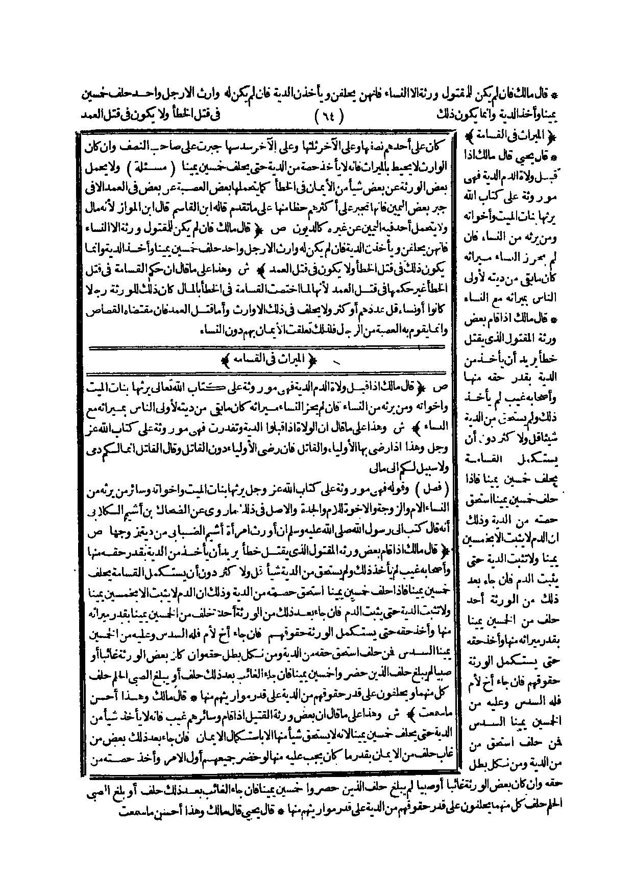 الْمِيرَاثُ فِي الْقَسَامَةِ (ص) : (قَالَ مَالِكٌ إذَا قَبِلَ وُلَاةُ الدَّمِ الدِّيَةَ فَهِيَ مَوْرُوثَةٌ عَلَى كِتَابِ اللَّهِ تَعَالَى يَرِثُهَا بَنَاتُ الْمَيِّتِ وَأَخَوَاتُهُ وَمَنْ يَرِثُهُ مِنْ النِّسَاءِ فَإِنْ لَمْ يَحُزْ النِّسَاءُ مِيرَاثَهُ كَانَ مَا بَقِيَ مِنْ دِيَتِهِ لِأَوْلَى النَّاسِ بِمِيرَاثِهِ مَعَ النِّسَاءِ) .