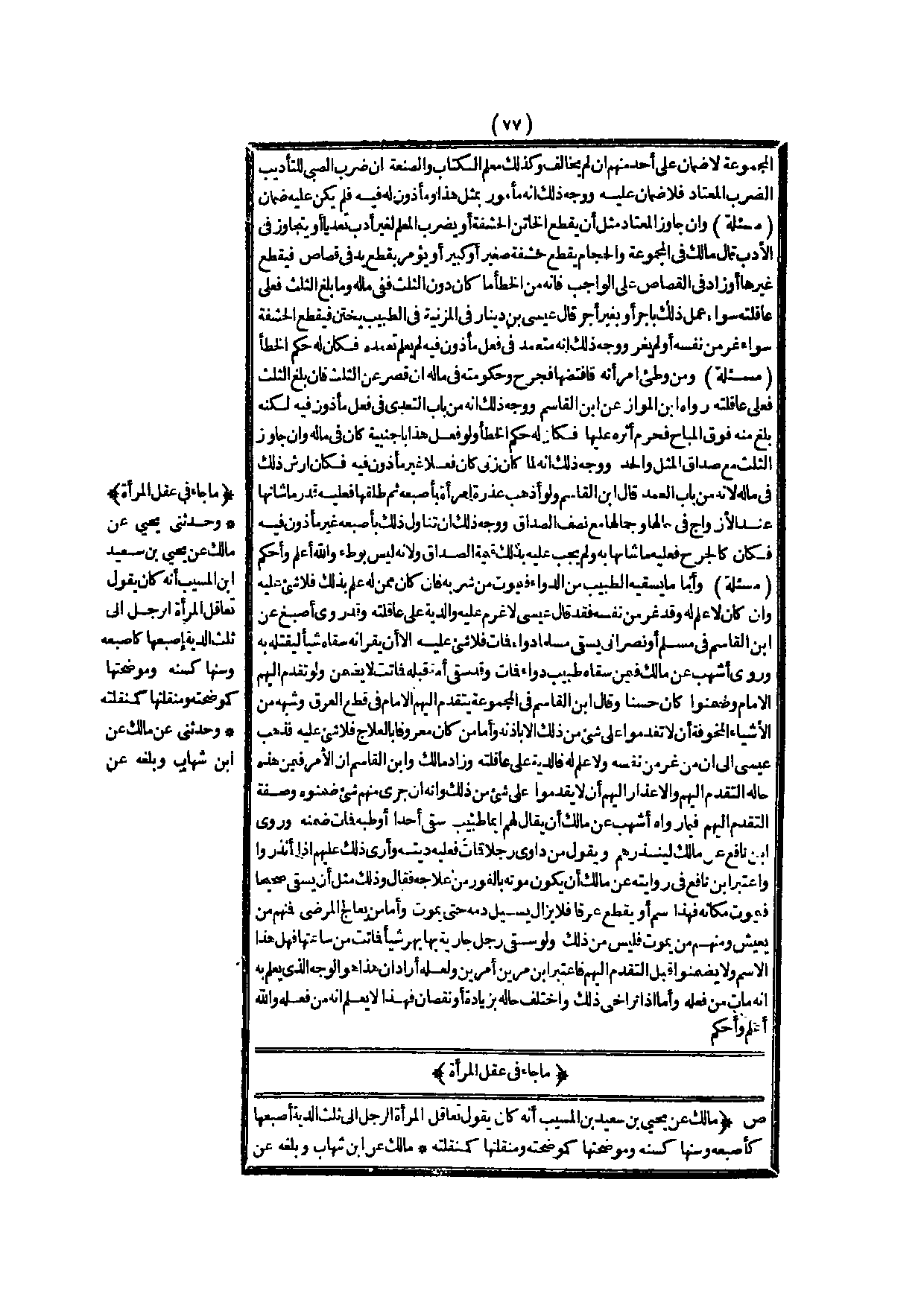 مَا جَاءَ فِي عَقْلِ الْمَرْأَةِ (ص) : (مَالِكٌ عَنْ يَحْيَى بْنِ سَعِيدِ بْنِ الْمُسَيِّبِ أَنَّهُ كَانَ يَقُولُ تُعَاقِلُ الْمَرْأَةُ الرَّجُلَ إلَى ثُلُثِ الدِّيَةِ أُصْبُعُهَا كَأُصْبُعِهِ، وَسِنُّهَا كَسِنِّهِ، وَمُوضِحَتُهَا كَمُوضِحَتِهِ، وَمُنَقِّلَتِهَا كَمُنَقِّلَتِهِ مَالِكٌ عَنْ ابْنِ شِهَابٍ، وَبَلَغَهُ عَنْ