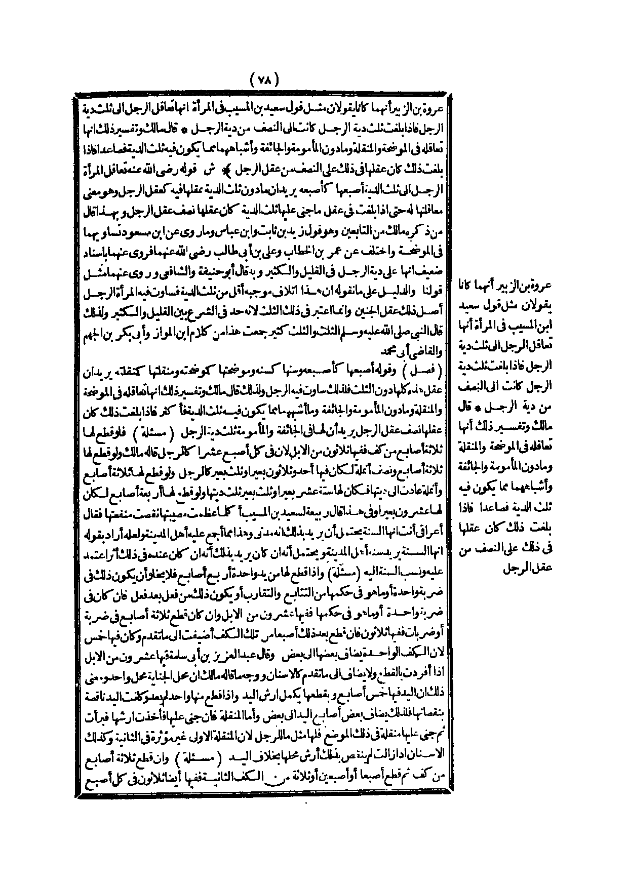 عُرْوَةَ بْنِ الزُّبَيْرِ أَنَّهُمَا كَانَا يَقُولَانِ مِثْلَ قَوْلِ سَعِيدِ بْنِ الْمُسَيِّبِ فِي الْمَرْأَةِ أَنَّهَا تُعَاقِلُ الرَّجُلَ إلَى ثُلُثِ دِيَةِ الرَّجُلِ فَإِذَا بَلَغَتْ ثُلُثَ دِيَةِ الرَّجُلِ كَانَتْ إلَى النِّصْفِ مِنْ دِيَةِ الرَّجُلِ قَالَ مَالِكٌ، وَتَفْسِيرُ ذَلِكَ أَنَّهَا تُعَاقِلُهُ فِي الْمُوضِحَةِ وَالْمُنَقِّلَةِ، وَمَا دُونَ الْمَأْمُومَةِ وَالْجَائِفَةِ، وَأَشْبَاهِهِمَا مِمَّا يَكُونُ فِيهِ ثُلُثُ الدِّيَةِ فَصَاعِدًا فَإِذَا بَلَغَتْ ذَلِكَ كَانَ عَقْلُهَا فِي ذَلِكَ عَلَى النِّصْفِ مِنْ عَقْلِ الرَّجُلِ)