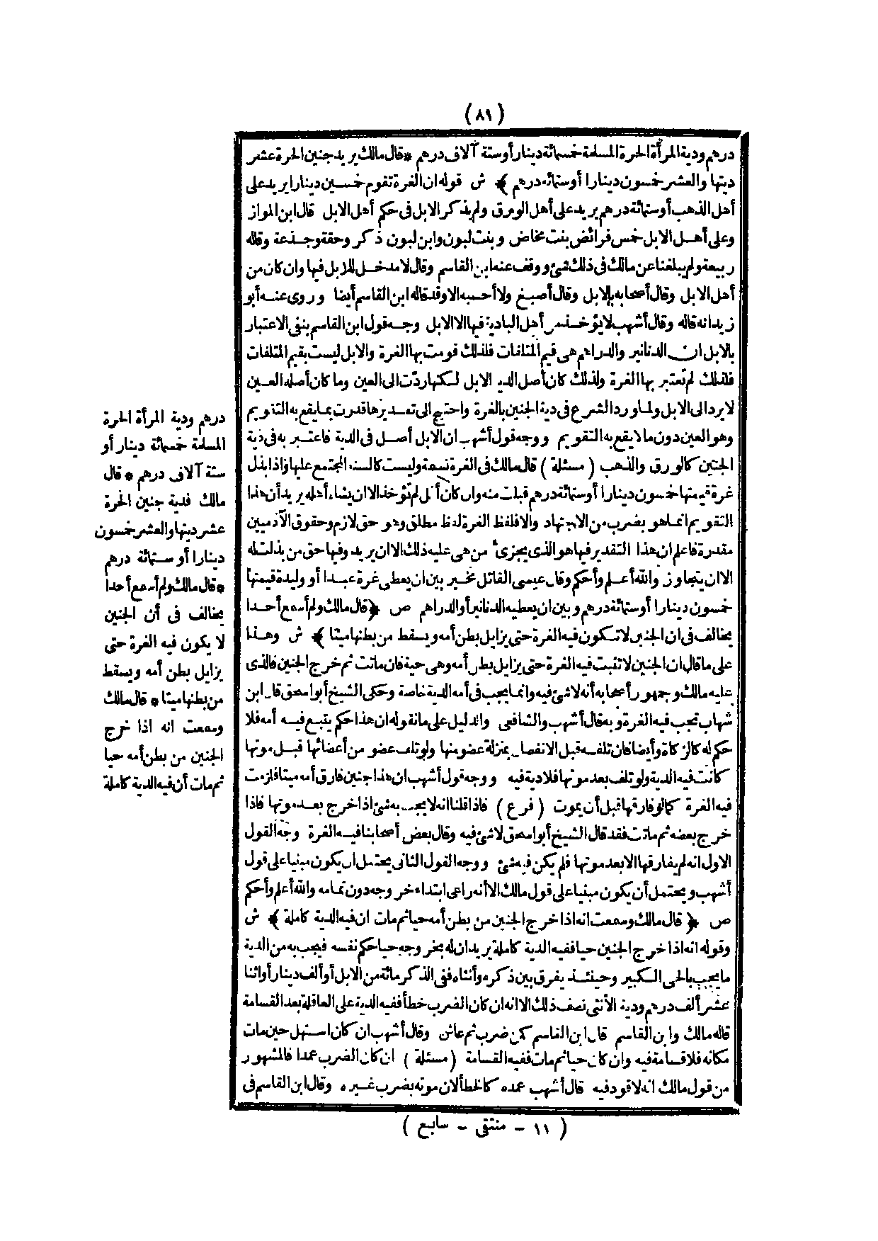 (ش) : وَهَذَا عَلَى مَا قَالَ أَنَّ الْجَنِينَ لَا تَثْبُتُ فِيهِ الْغُرَّةُ حَتَّى يُزَايِلَ بَطْنَ أُمِّهِ، وَهِيَ حَيَّةٌ فَإِنْ مَاتَتْ، ثُمَّ خَرَجَ الْجَنِينُ فَاَلَّذِي عَلَيْهِ مَالِكٌ، وَجُمْهُورُ أَصْحَابِهِ أَنَّهُ لَا شَيْءَ فِيهِ، وَإِنَّمَا يَجِبُ فِي أُمِّهِ الدِّيَةُ خَاصَّةً، وَحَكَى الشَّيْخُ أَبُو إِسْحَاقَ قَالَ ابْنُ شِهَابٍ تَجِبُ فِيهِ الْغُرَّةُ، وَبِهِ قَالَ أَشْهَبُ وَالشَّافِعِيُّ، وَالدَّلِيلُ عَلَى مَا نَقُولُهُ أَنَّ هَذَا حُكْمٌ يَتَّبِعُ فِيهِ أُمَّهُ فَلَا حُكْمَ لَهُ كَالزَّكَاةِ، وَأَيْضًا فَإِنَّ تَلَفَهُ قَبْلَ الِانْفِصَالِ بِمَنْزِلَةِ عُضْوٍ مِنْهَا، وَلَوْ تَلِفَ عُضْوٌ مِنْ أَعْضَائِهَا قَبْلَ مَوْتِهَا كَانَتْ فِيهِ الدِّيَةُ، وَلَوْ تَلِفَ بَعْدَ مَوْتِهَا فَلَا دِيَةَ فِيهِ، وَوَجْهُ قَوْلِ أَشْهَبَ أَنَّ هَذَا جَنِينٌ فَارَقَ أُمَّهُ مَيِّتًا فَلَزِمَتْ فِيهِ الْغُرَّةُ كَمَا لَوْ فَارَقَهَا قَبْلَ أَنْ يَمُوتَ.
