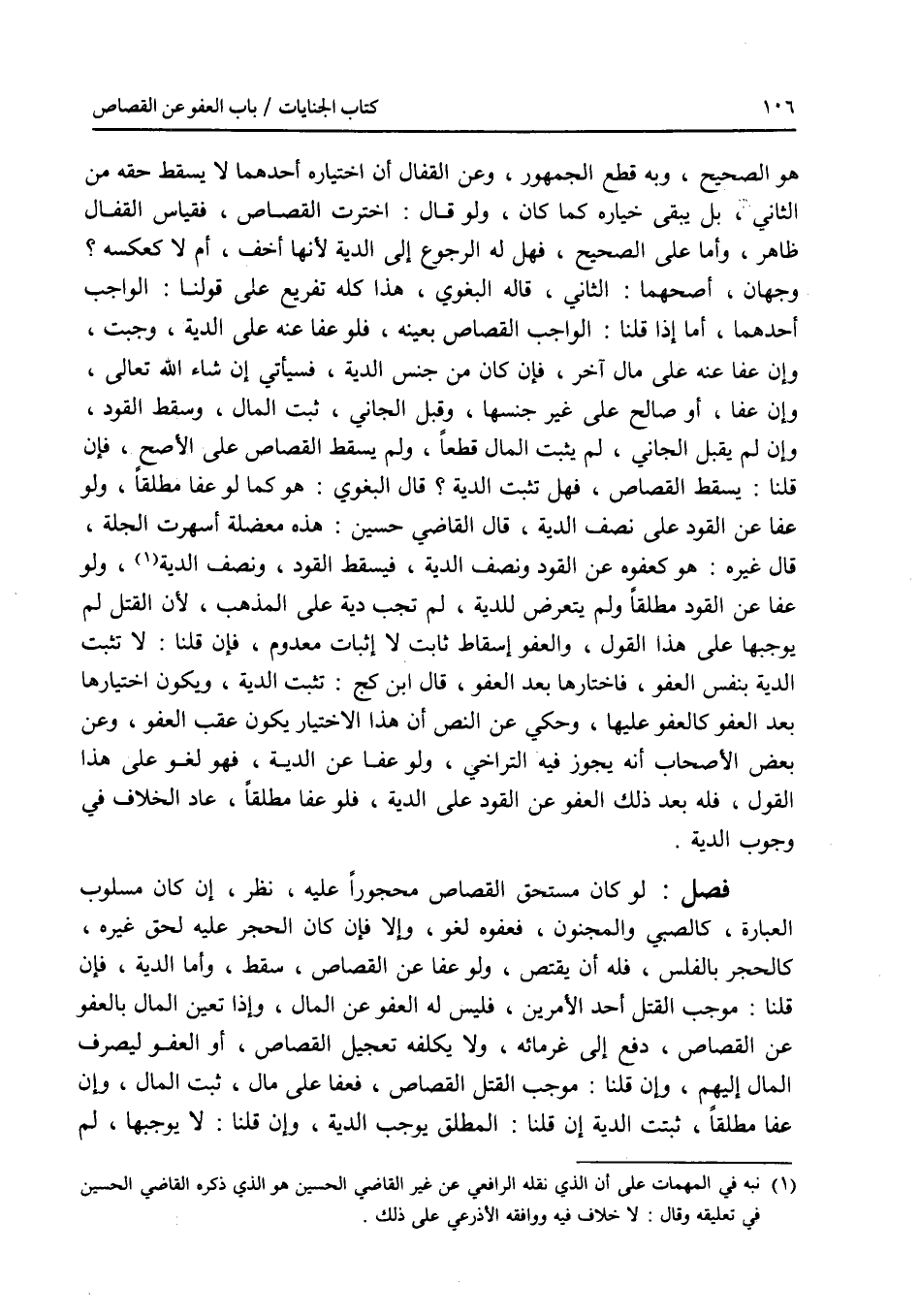 هو الصحيح، وبه قطع الجمهور، وعن القفال أن اختياره أحدهما لا يسقط حقه من الثاني، بل يبقى خياره كما كان، ولو قال: اخترت القصاص، فقياس القفال ظاهر، وأما على الصحيح، فهل له الرجوع إلى الدية لانها أخف، أم لا كعكسه ؟ وجهان، أصحهما: الثاني، قاله البغوي، هذا كله تفريع على قولنا: الواجب أحدهما، أما إذا قلنا: الواجب القصاص بعينه، فلو عفا عنه على الدية، وجبت، وإن عفا عنه على مال آخر، فإن كان من جنس الدية، فسيأتي إن شاء الله تعالى، وإن عفا، أو صالح على غير جنسها، وقبل الجاني، ثبت المال، وسقط القود، وإن لم يقبل الجاني، لم يثبت المال قطعا، ولم يسقط القصاص على الاصح، فإن قلنا: يسقط القصاص، فهل تثبت الدية ؟ قال البغوي: هو كما لو عفا مطلقا، ولو عفا عن القود على نصف الدية، قال القاضي حسين: هذه معضلة أسهرت الجلة، قال غيره: هو كعفوه عن القود ونصف الدية، فيسقط القود، ونصف الدية، ولو عفا عن القود مطلقا ولم يتعرض للدية، لم تجب دية على المذهب، لان القتل لم يوجبها على هذا القول، والعفو إسقاط ثابت لا إثبات معدوم، فإن قلنا: لا تثبت الدية بنفس العفو، فاختارها بعد العفو، قال ابن كج: تثبت الدية، ويكون اختيارها بعد العفو كالعفو عليها، وحكي عن النص أن هذا الاختيار يكون عقب العفو، وعن بعض الاصحاب أنه يجوز فيه التراخي، ولو عفا عن الدية، فهو لغو على هذا القول، فله بعد ذلك العفو عن القود على الدية، فلو عفا مطلقا، عاد الخلاف في وجوب الدية. فصل لو كان مستحق القصاص محجورا عليه، نظر، إن كان مسلوب العبارة، كالصبي والمجنون، فعفوه لغو، وإلا فإن كان الحجر عليه لحق غيره، كالحجر بالفلس، فله أن يقتص، ولو عفا عن القصاص، سقط، وأما الدية، فإن قلنا: موجب القتل أحد الامرين، فليس له العفو عن المال، وإذا تعين المال بالعفو عن القصاص، دفع إلى غرمائه، ولا يكلفه تعجيل القصاص، أو العفو ليصرف المال إليهم، وإن قلنا: موجب القتل القصاص، فعفا على مال، ثبت المال، وإن عفا مطلقا، ثبتت الدية إن قلنا: المطلق يوجب الدية، وإن قلنا: لا يوجبها، لم