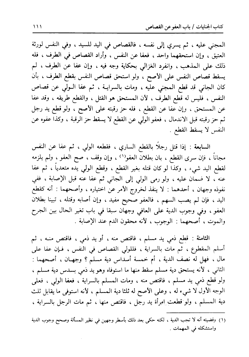 المجني عليه، ثم يسري إلى نفسه، فالقصاص في اليد للسيد، وفي النفس لورثة العتيق، وإن استحقهما واحد، فعفا عن النفس، وأراد القصاص في الطرف، فله ذلك على المذهب، وانفرد الغزالي بحكاية وجه فيه، وإن عفا عن الطرف، لم يسقط قصاص النفس على الاصح، ولو استحق قصاص النفس بقطع الطرف، بأن كان الجاني قد قطع المجني عليه، ومات بالسراية، ثم عفا الولي عن قصاص النفس، فليس له قطع الطرف، لان المستحق هو القتل، والقطع طريقه، وقد عفا عن المستحق، وإن عفا عن القطع، فله حز رقبته على الاصح، ولو قطع يد رجل ثم حز رقبته قبل الاندمال، فعفو الولي عن القطع لا يسقط حز الرقبة، وكذا عفوه عن النفس لا يسقط القطع. السابعة: إذا قتل رجلا بالقطع الساري، فقطعه الولي، ثم عفا عن النفس مجانا، فإن سرى القطع، بان بطلان العفو، وإن وقف، صح العفو، ولم يلزمه لقطع اليد شئ، وكذا لو كان قتله بغير القطع، وقطع الولي يده متعديا، ثم عفا عنه، لا ضمان عليه، ولو رمى الولي إلى الجاني ثم عفا عنه قبل الاصابة، ففي نفوذه وجهان، أحدهما: لا ينفذ لخروج الامر عن اختياره، وأصحهما: أنه كقطع اليد، فإن لم يصب السهم، فالعفو صحيح مفيد، وإن أصابه وقتله، تبينا بطلان العفو، وفي وجوب الدية على العافي وجهان سبقا في باب تغير الحال بين الجرح والموت، أصحهما: الوجوب، لانه محقون الدم عند الاصابة. الثامنة: قطع ذمي يد مسلم، فاقتص منه، أو يد ذمي، فاقتص منه، ثم أسلم المقطوع، ثم مات بالسراية، فللولي القصاص في النفس، فإن عفا على مال، فهل له نصف الدية، أم خمسة أسداس دية مسلم ؟ وجهان، أصحهما: الثاني، لانه يستحق دية مسلم سقط منها ما استوفاه وهو يد ذمي بسدس دية مسلم، ولو قطع ذمي يد مسلم، فاقتص منه، ومات المسلم بالسراية، فعفا الولي، فعلى الوجه الاول لا شئ له، وعلى الاصح له ثلثا دية المسلم، لانه استوفى ما يقابل ثلث دية المسلم، ولو قطعت امرأة يد رجل، فاقتص منها، ثم مات الرجل بالسراية،