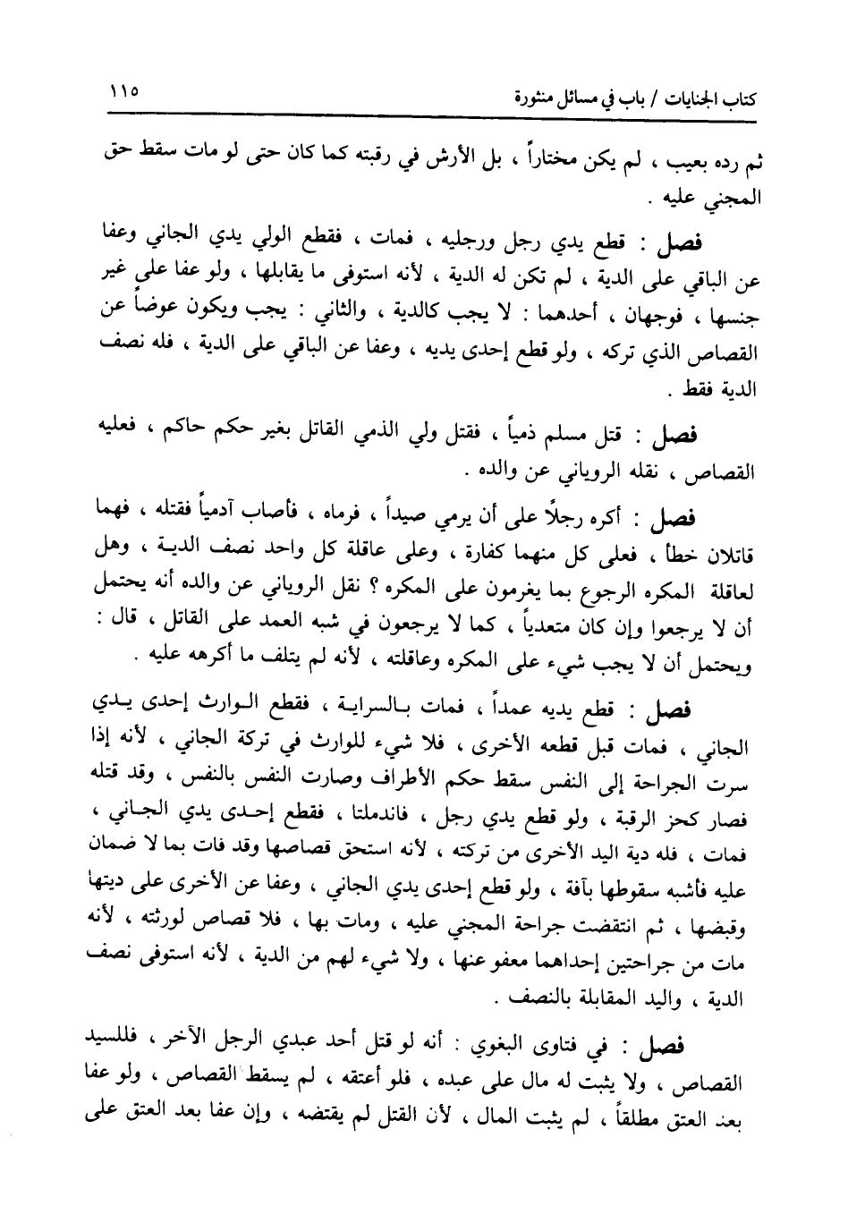 ثم رده بعيب، لم يكن مختارا، بل الارش في رقبته كما كان حتى لو مات سقط حق المجني عليه. فصل قطع يدي رجل ورجليه، فمات، فقطع الولي يدي الجاني وعفا عن الباقي على الدية، لم تكن له الدية، لانه استوفى ما يقابلها، ولو عفا على غير جنسها، فوجهان، أحدهما: لا يجب كالدية، والثاني: يجب ويكون عوضا عن القصاص الذي تركه، ولو قطع إحدى يديه، وعفا عن الباقي على الدية، فله نصف الدية فقط. فصل قتل مسلم ذميا، فقتل ولي الذمي القاتل بغير حكم حاكم، فعليه القصاص، نقله الروياني عن والده. فصل أكره رجلا على أن يرمي صيدا، فرماه، فأصاب آدميا فقتله، فهما قاتلان خطأ، فعلى كل منهما كفارة، وعلى عاقلة كل واحد نصف الدية، وهل لعاقلة المكره الرجوع بما يغرمون على المكره ؟ نقل الروياني عن والده أنه يحتمل أن لا يرجعوا وإن كان متعديا، كما لا يرجعون في شبه العمد على القاتل، قال: ويحتمل أن لا يجب شئ على المكره وعاقلته، لانه لم يتلف ما أكرهه عليه. فصل قطع يديه عمدا، فمات بالسراية، فقطع الوارث إحدى يدي الجاني، فمات قبل قطعه الاخرى، فلا شئ للوارث في تركة الجاني، لانه إذا سرت الجراحة إلى النفس سقط حكم الاطراف وصارت النفس بالنفس، وقد قتله فصار كحز الرقبة، ولو قطع يدي رجل، فاندملتا، فقطع إحدى يدي الجاني، فمات، فله دية اليد الاخرى من تركته، لانه استحق قصاصها وقد فات بما لا ضمان عليه فأشبه سقوطها بآفة، ولو قطع إحدى يدي الجاني، وعفا عن الاخرى على ديتها وقبضها، ثم انتقضت جراحة المجني عليه، ومات بها، فلا قصاص لورثته، لانه مات من جراحتين إحداهما معفو عنها، ولا شئ لهم من الدية، لانه استوفى نصف الدية، واليد المقابلة بالنصف. فصل في فتاوى البغوي: أنه لو قتل أحد عبدي الرجل الآخر، فللسيد القصاص، ولا يثبت له مال على عبده، فلو أعتقه، لم يسقط القصاص، ولو عفا بعد العتق مطلقا، لم يثبت المال، لان القتل لم يقتضه، وإن عفا بعد العتق على