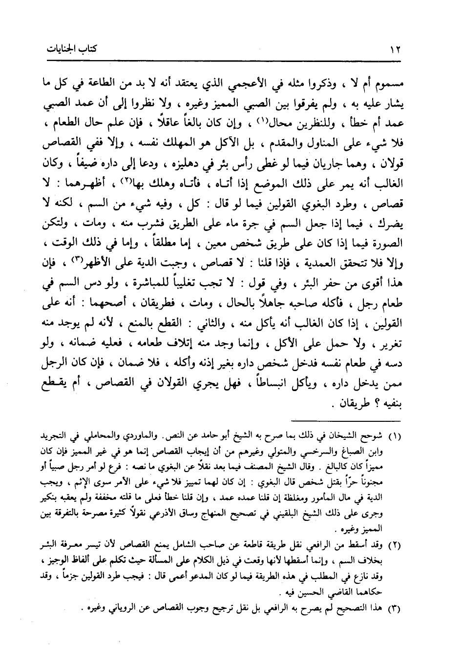 مسموم أم لا، وذكروا مثله في الاعجمي الذي يعتقد أنه لا بد من الطاعة في كل ما يشار عليه به، ولم يفرقوا بين الصبي المميز وغيره، ولا نظروا إلى أن عمد الصبي عمد أم خطأ، وللنظرين محال، وإن كان بالغا عاقلا، فإن علم حال الطعام، فلا شئ على المناول والمقدم، بل الآكل هو المهلك نفسه، وإلا ففي القصاص قولان، وهما جاريان فيما لو غطى رأس بئر في دهليزه، ودعا إلى داره ضيفا، وكان الغالب أنه يمر على ذلك الموضع إذا أتاه، فأتاه وهلك بها، أظهرهما: لا قصاص، وطرد البغوي القولين فيما لو قال: كل، وفيه شئ من السم، لكنه لا يضرك، وفيما إذا جعل السم في جرة ماء على الطريق فشرب منه، ومات، ولتكن الصورة فيما إذا كان على طريق شخص معين، إما مطلقا، وإما في ذلك الوقت، وإلا فلا تتحقق العمدية، فإذا قلنا: لا قصاص، وجبت الدية على الاظهر، فإن هذا أقوى من حفر البئر، وفي قول: لا تجب تغليبا للمباشرة، ولو دس السم في طعام رجل، فأكله صاحبه جاهلا بالحال، ومات، فطريقان، أصحهما: أنه على القولين، إذا كان الغالب أنه يأكل منه، والثاني: القطع بالمنع، لانه لم يوجد منه تغرير، ولا حمل على الاكل، وإنما وجد منه إتلاف طعامه، فعليه ضمانه، ولو دسه في طعام نفسه فدخل شخص داره بغير إذنه وأكله، فلا ضمان، فإن كان الرجل ممن يدخل داره، ويأكل انبساطا، فهل يجري القولان في القصاص، أم يقطع بنفيه ؟ طريقان.